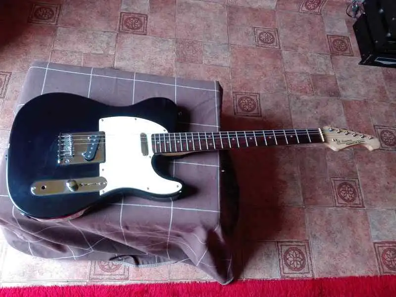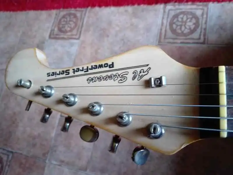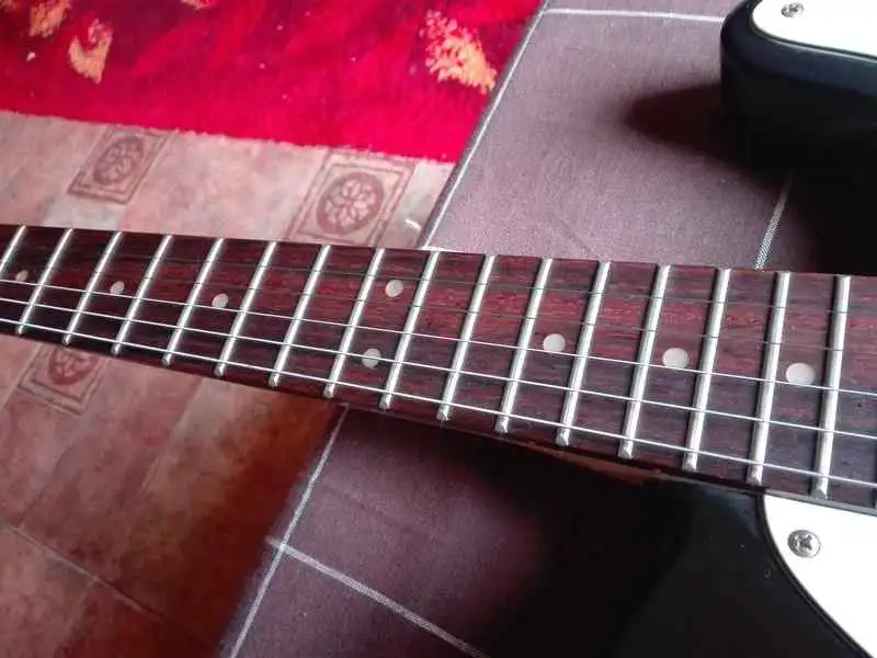 Die Gitarre wurde aus Deutschland importiert, die Saiten sind rostig und auf der Rückseite gibt es auch Farbabplatzer.