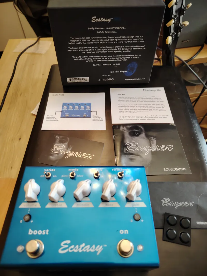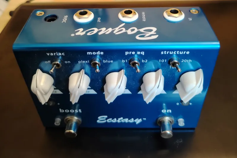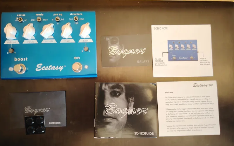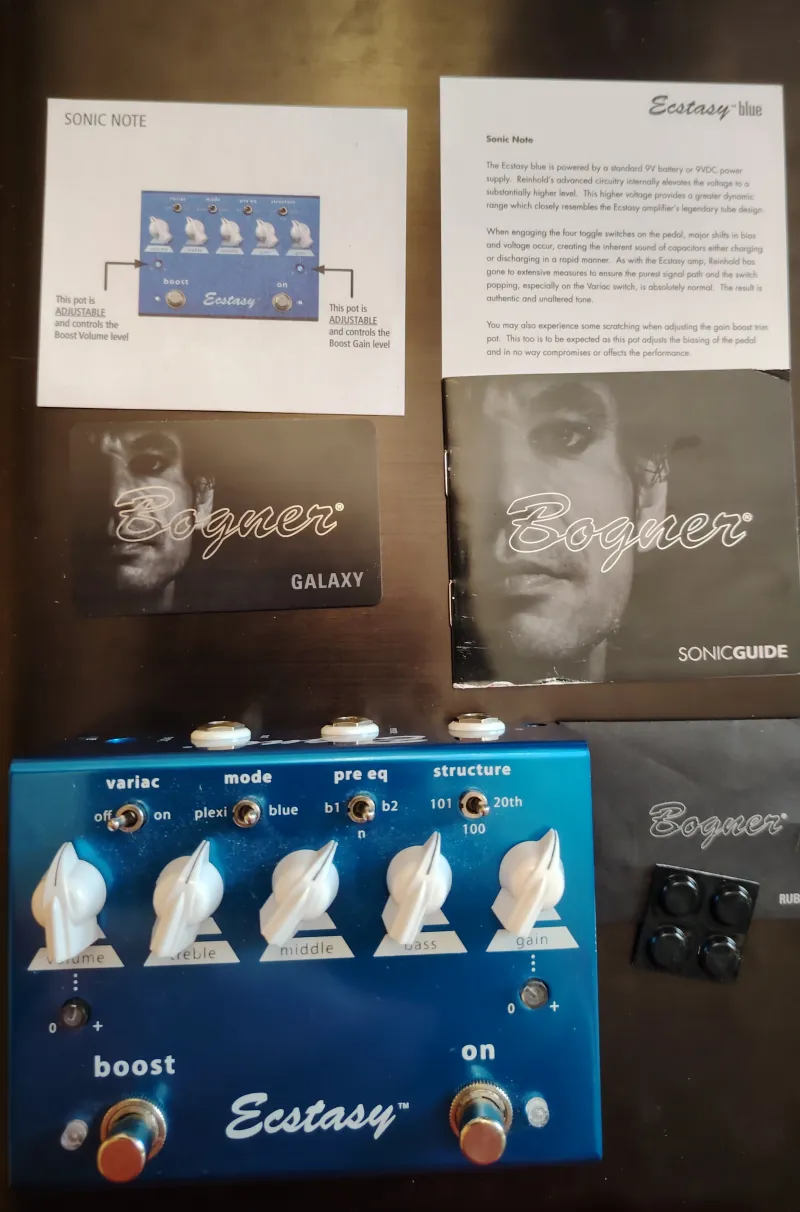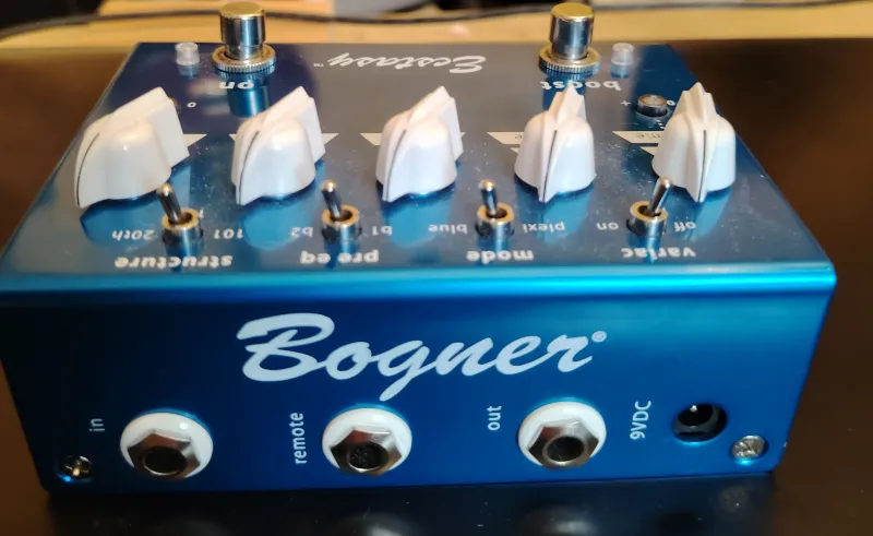 Kihasználatlanság miatt eladó egy szinte új Bogner Ecstasy Blue gitáreffekt. gitáreffekt: overdrive/distortion pedál, ˝blue channel“ Bogner Ectasy erősítőkön alapszik, klasszikus hangzás, gazdag beállítási lehetőségek, Volume, Gain szabályzók, 3 sávos EQ, Variac, Mode, Pre Eq és Structure kapcsolók, true bypass, két lábkapcsoló: On és Boost, 1/4˝ In/Out konnektorok, 1/4˝ remote konnektor, 9V elemmel vagy adapterrel működtethető (nem tartozék), méretek: 63,5mm x 127mm x 178mm, súly: 725gVerknüpfter Testbericht