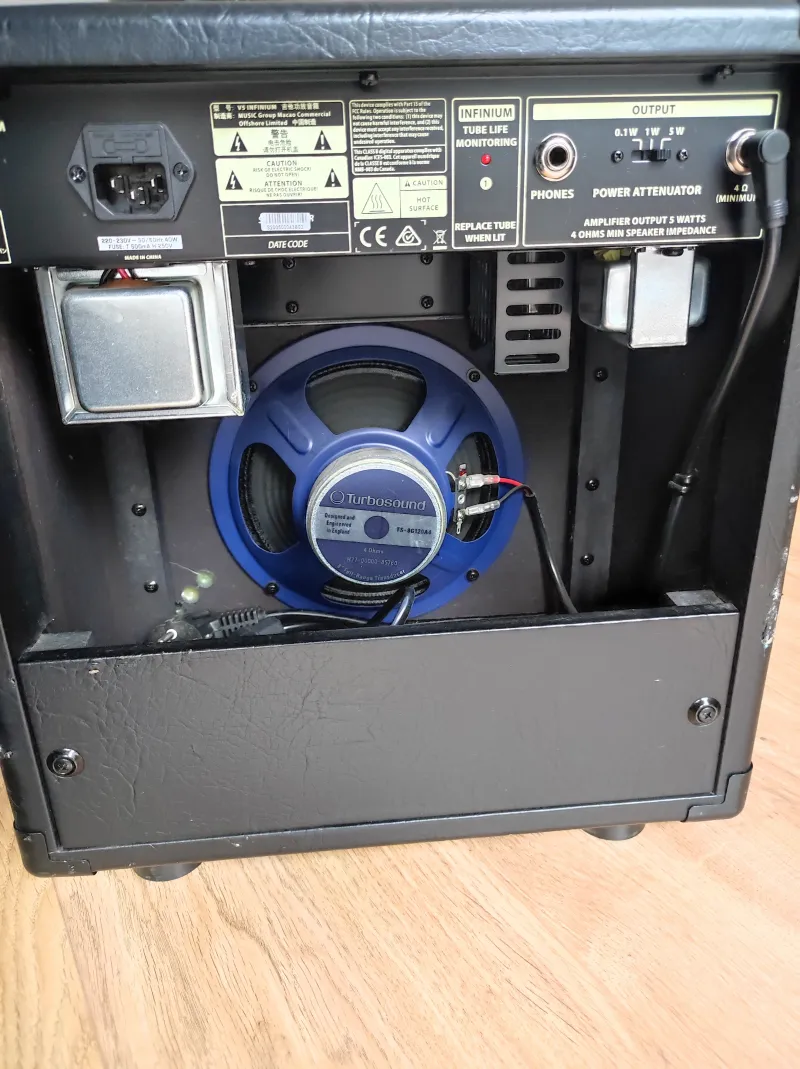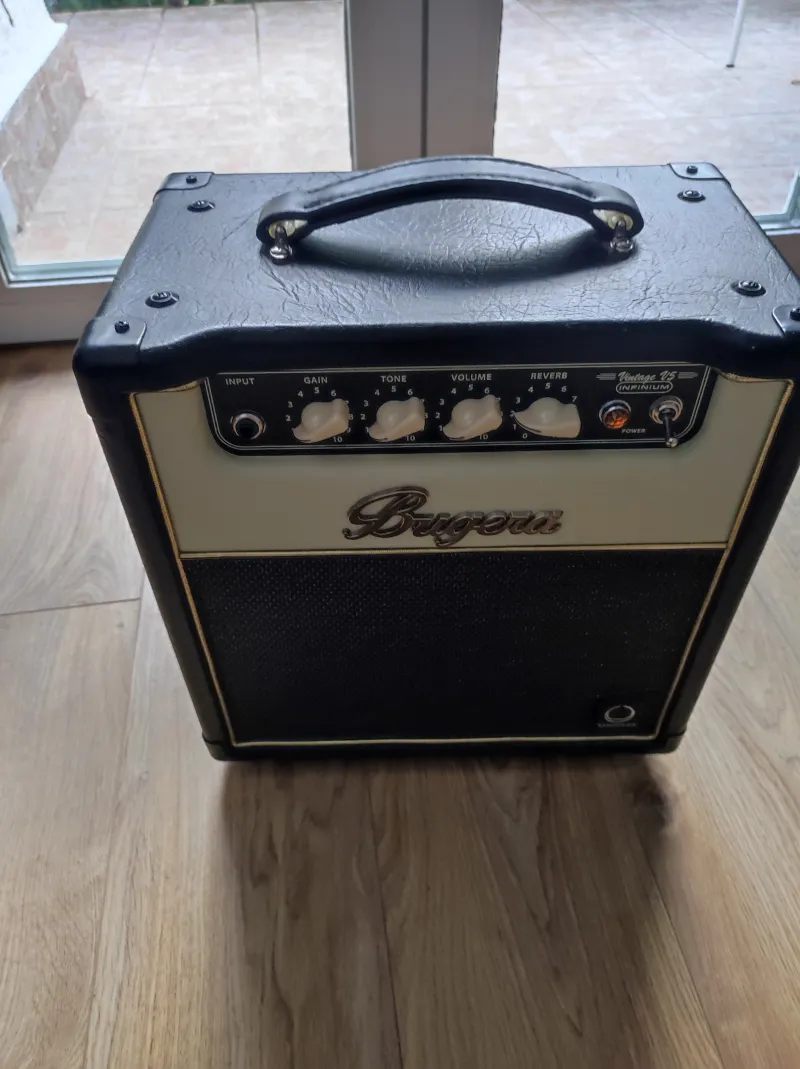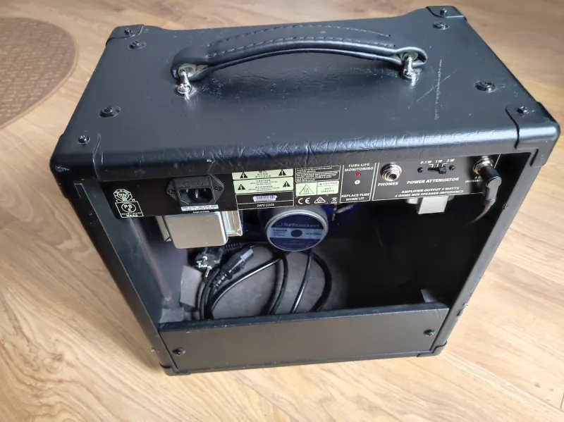 Full csöves gitárkombó, 8˝-os Turbosound hangszóró, reverb. Állítható teljesítmény: 5W, 1W, 0,1W.Remek, de kihasználatlan.