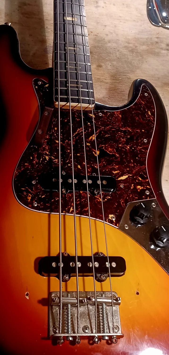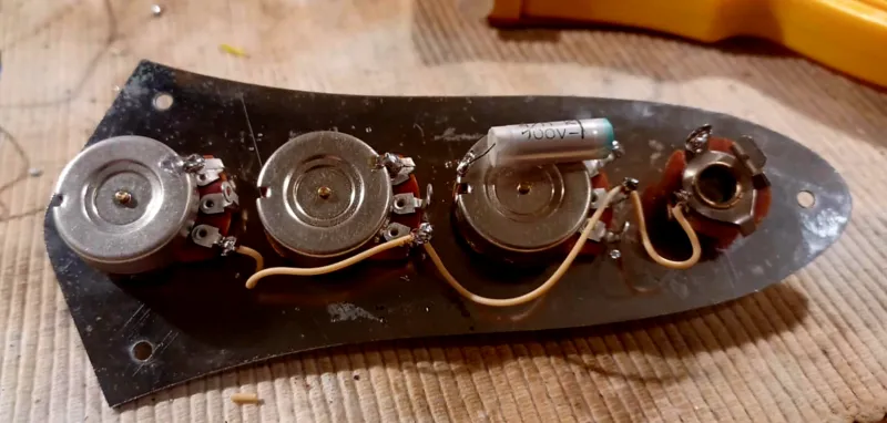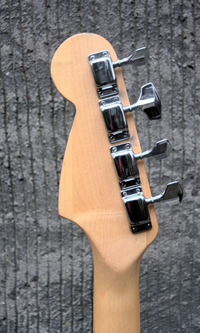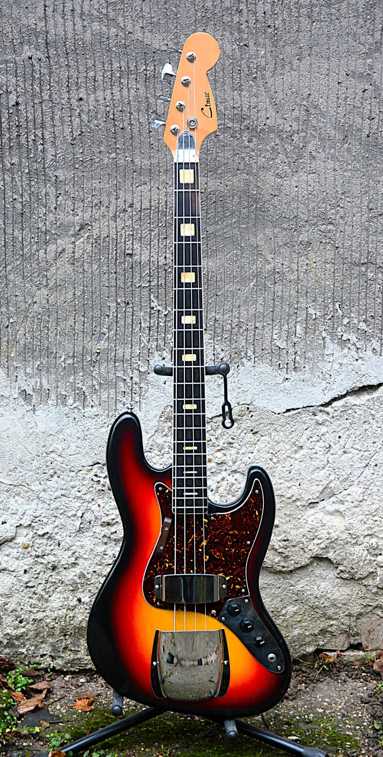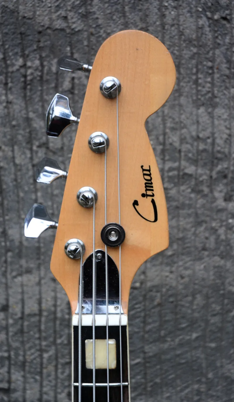 Cimar Jazz Bass 1908. A hangszer az 1970-es közepén, a lawsuit-érában készült Japánban az Ibanez által működtetett Hoshino Gakki gyárban, a korabeli Fender Jazz Bass alapján. Az új potmétereken (fotó) kívül mindene eredeti. Kiváló állapotban, nem csak korához képest.Verknüpfter Testbericht