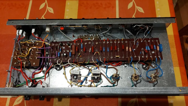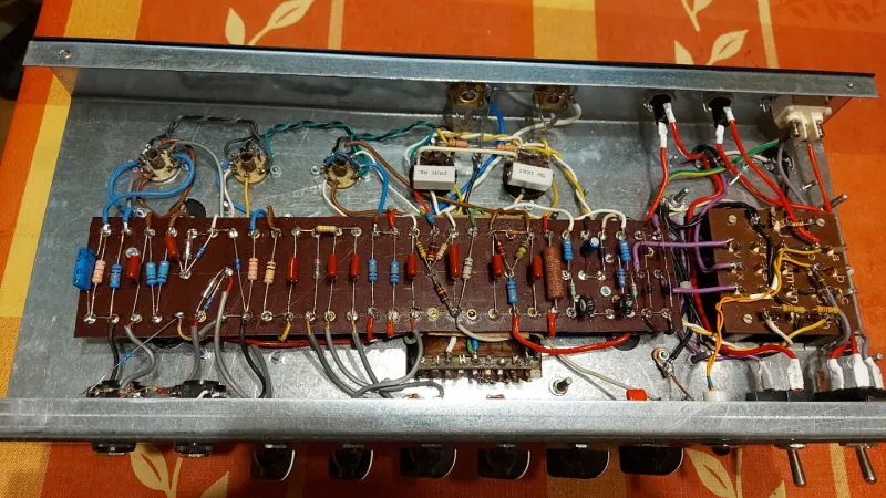 A csöves gitárerősítők egyik kedvelt darabjának - a Marshall JCM 800 Lead Series 2204-nek a kapcsolási rajza alapján, egyedileg, forléces szereléssel, kézi huzalozással /ponttól-pontig/ elkészített és gondosan bemért másolata. Új, csak beüzemelve volt. Gyáritrafók, új alkatrészek, bőr fogantyú. (3x Marshall ECC83, 2x párba válogatott új JJ EL34, -Biasolhatóan). Szép, tiszta rock sound, nagy dinamikával, igen jól effektezhetően, Hangfal kimenete 8 és 16 Ohm.(A kimenőről kivezethető a 4 Ohm is.) Szép, tiszta rock sound,hatalmas dinamikával, igen jól effektezhetően. Személyes meghallgatását javaslom, de bizalom esetén postázom.(500x230x230 mm)