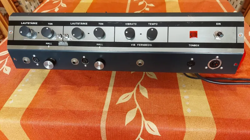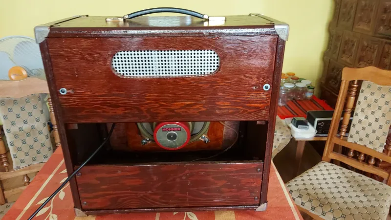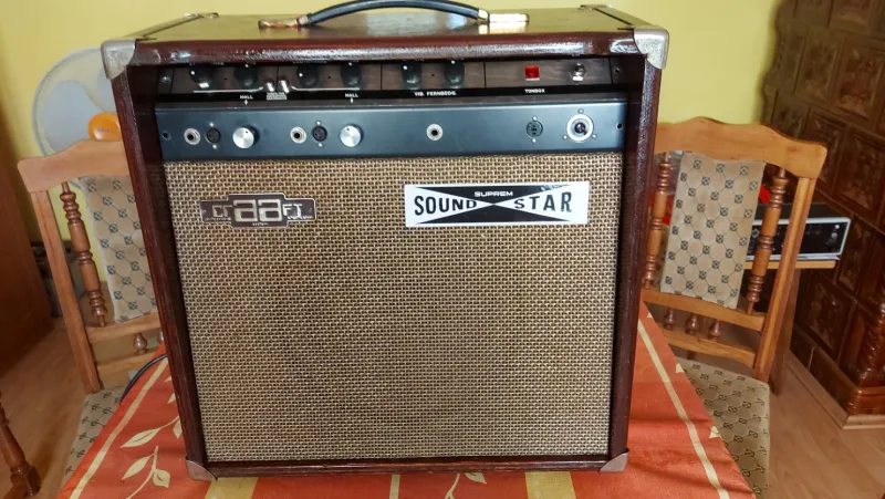 Suprem Sound Star full csöves 20W-os gitárkombó eredeti állapotú erősítője a Solton Chorus 50 gitárkombó dobozában új csövekkel (1x Tungstram EZ81, 1x Tungstram ECL80, 2x 6N2P-EV=ECC83, 2x 6P14P=EL84), a Hohner csöves kombó szélessávú hangszórójával. Az erősítő beállítva, bemérve, hibátlan működéssel. A gitárerősítőnek összesen négy bemenete van, mindegyik párhuzamosan használható. Minden két bemenet külön csatornához van rendelve. A Vibrato/tremoló hangja legendás, egyike a legszebbeknek. A reverb (rugós zengető Accutronics 4FB2A1C) mindkét csatornán külön állítható és lábkapcsolóval ki,-és bekapcsolható. Hangja nagyon sokoldalú, csodálatosan karakteres, telített és szép - a Supremektől megszokott.(52x25-29x52 cm)