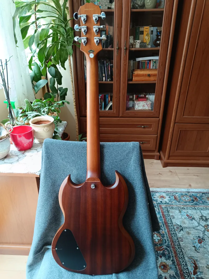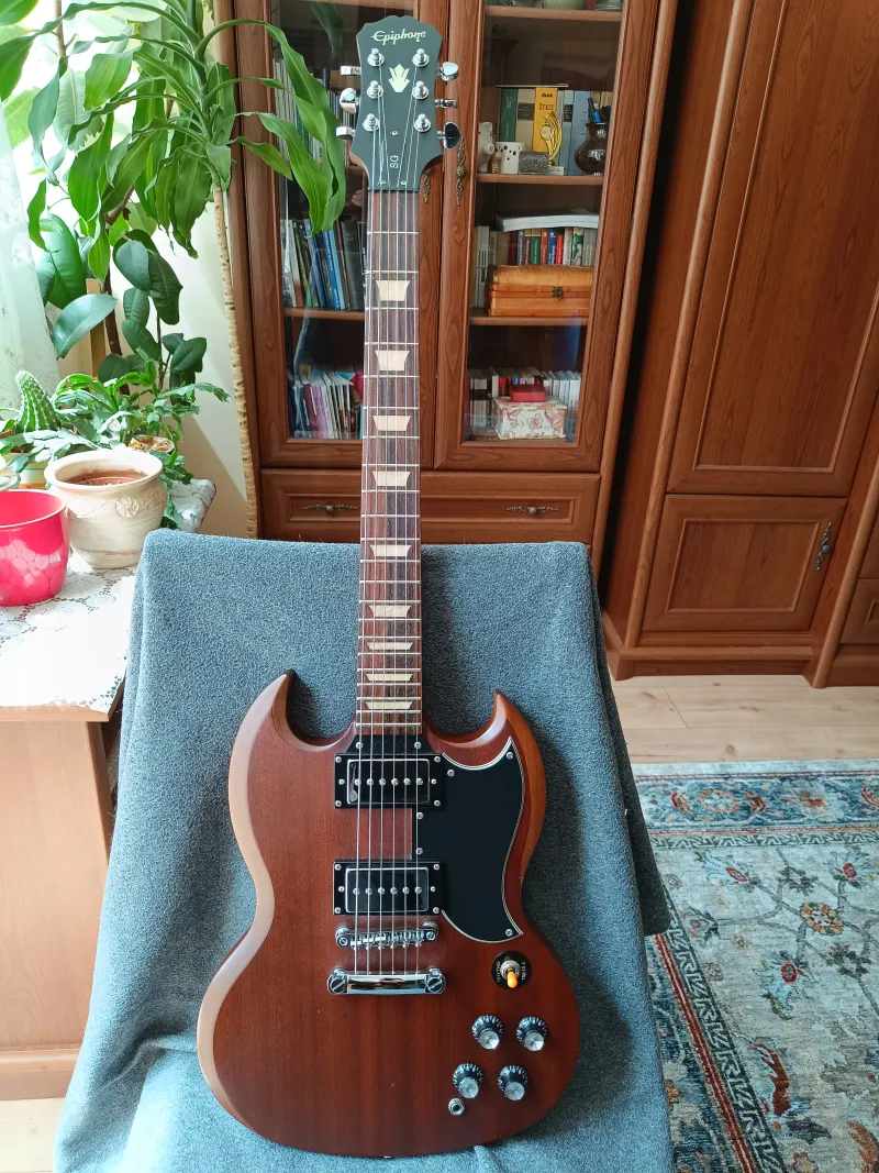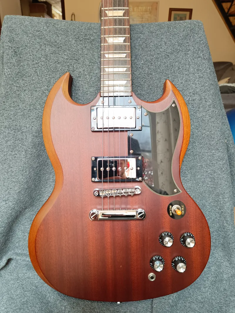 Epiphone SG G-400 P90 Worn Brown elektromos gitár szép állapotban, profin beállítva- P90 Alnico V hangszedőkkel, PAF hangzás, több magas hanggal, kifejezetten jó blues-hoz. Nagyon jó átmenet a vastag humbucker és a vékony single coil hangzás között. Van fénye, mégis dögös hang.