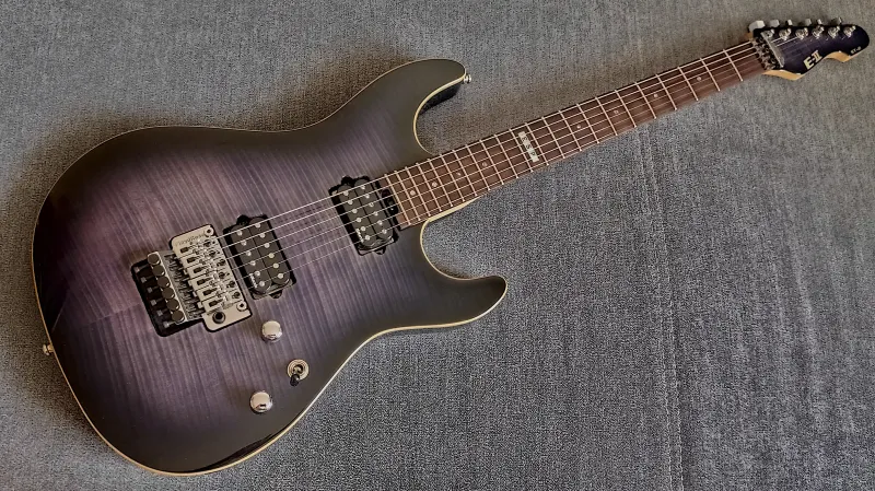 Eladó egy ritka, 2013-as japán ESP E-II ST-2 elektromos gitár!Hárs/basswood test, lángolt juhar/flamed maple top, csavarozott madárszemes juhar nyak, rózsafa fogólap, 22 XJ bund (tökéletes állapotúak), felezhető DiMarzio Custom hangszedők, Gotoh kulcsok, Original Floyd Rose tremoló, Reindeer Blue szín, 3,7 kg. Műanyag keménytokot adok hozzá.