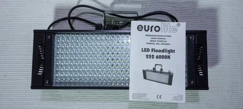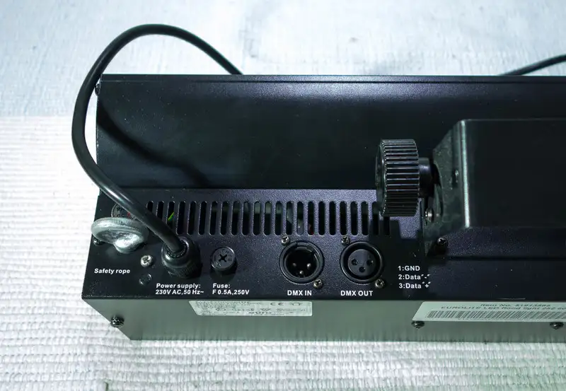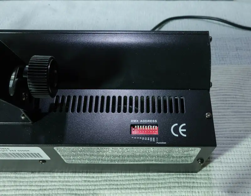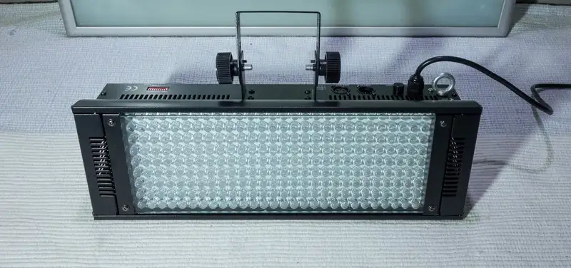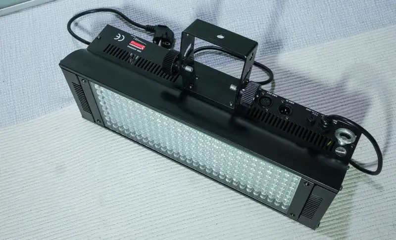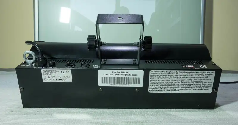 huendeskesKompakter LED-Effektstrahler (Floodlight) mit Montagebügel, DMX-Steuerung und DIP-Schaltern.