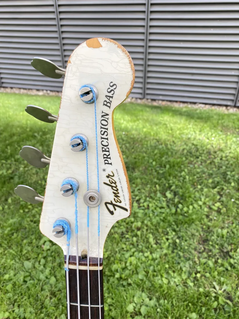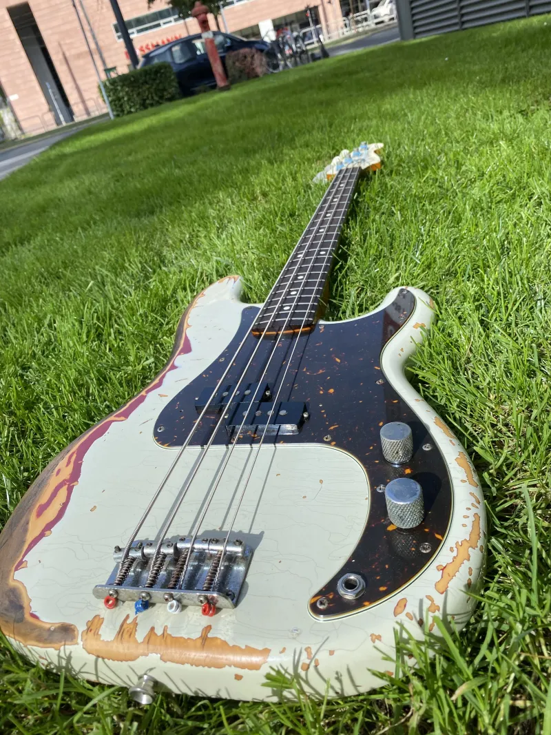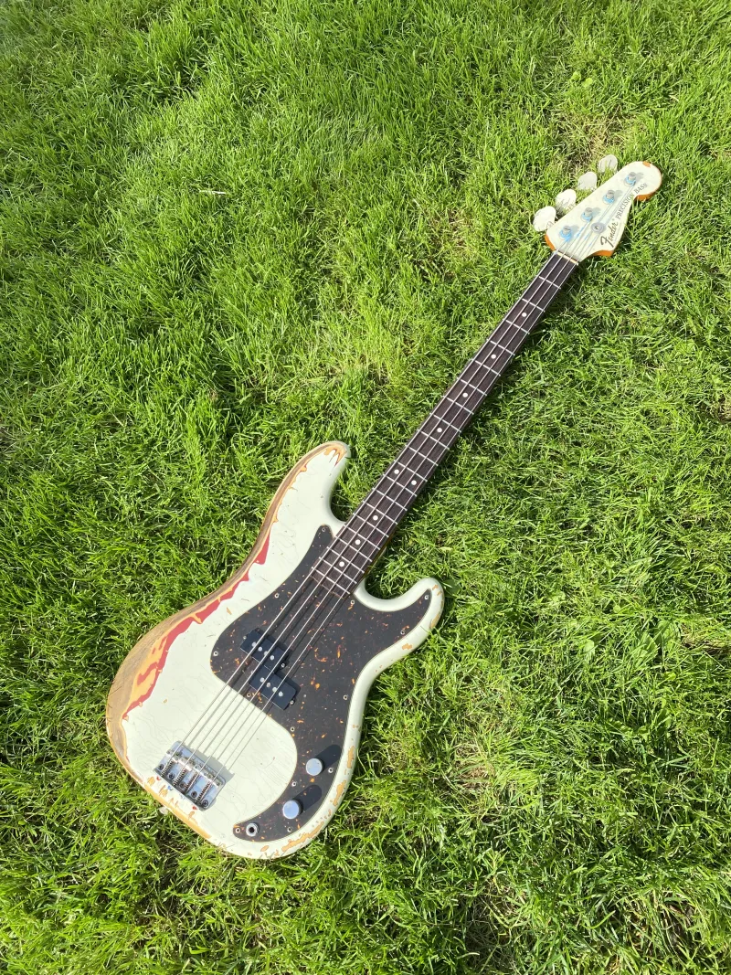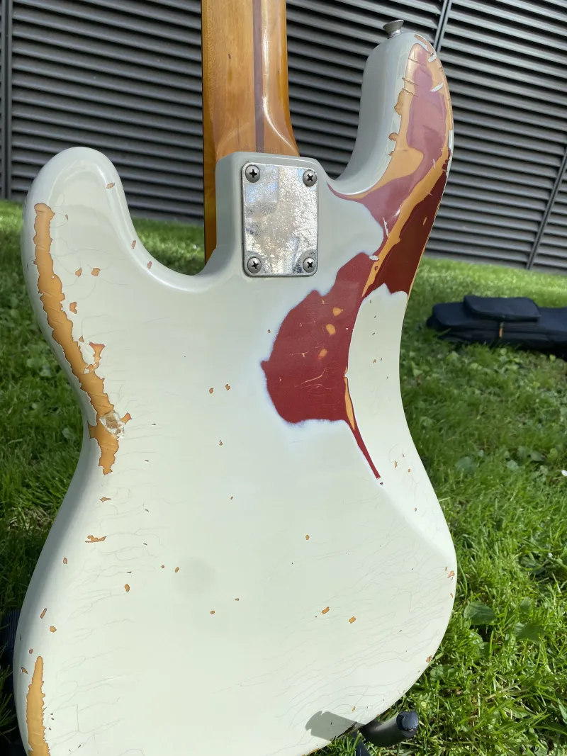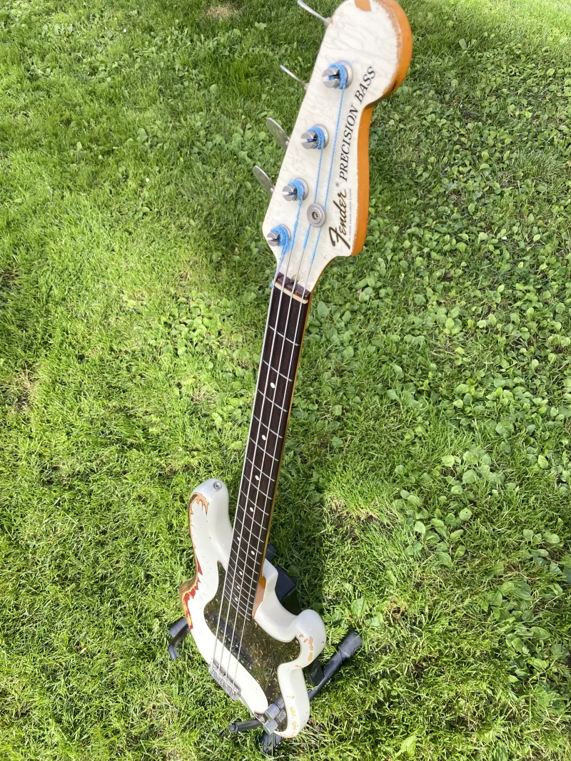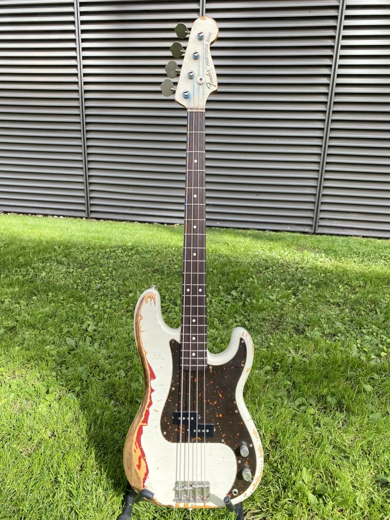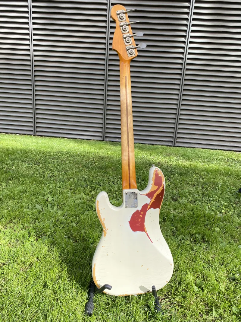 Eladó egy relickelt, eredeti srandard Fender Precision Bass. Made in Japan, 1995. A hangszer eredetileg fehér színű volt, lakkozott, szatén fejjel, melyet kérésre átfesetett az előző tulaj, 2 rétegben először ˝red˝, majd rá ˝sonic blue˝ színre, matching headstockkal, majd reliceltette, a Scott Divine legendás Precision Bass mintájára. Minden alkatrésze eredeti, gyári, csupán relicelve lettek a következők: csavarok, hangolókulcsok, potméter knobok, a húrláb, a pickup vasmagok, a heveder rögzítők, a koptató. A test üregei kaptak egy teljes fóliás árnyékolást az elektronika beszerelése előtt. Abszolut zajmentes a hangszer. Alacsony húrmagasság, baromi kényelmes játék, dögös preckó hang. A hangszer eredetét tudom igazolni, az eredeti állapotról és a munkafolyamatokról a fotók megvannak (az előző tulajtól).