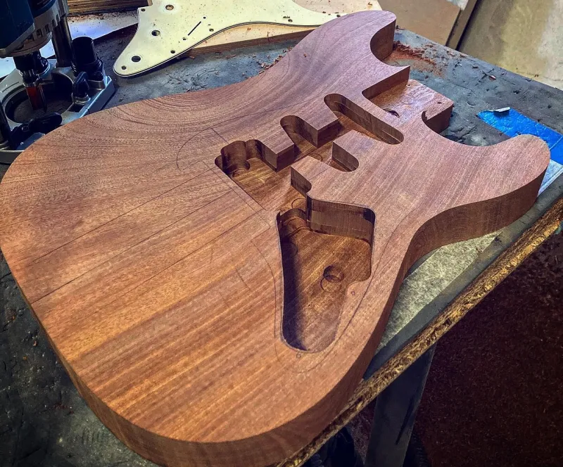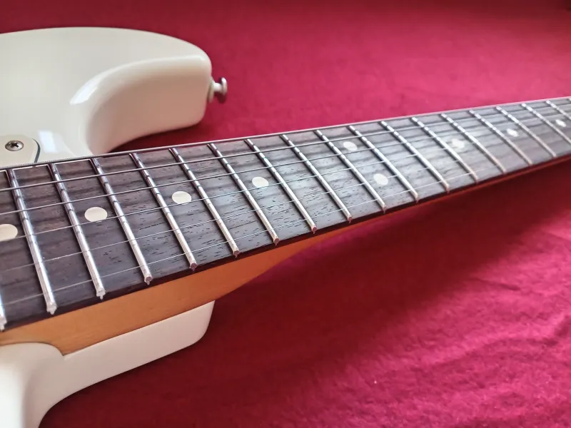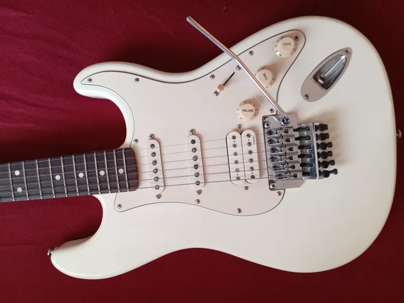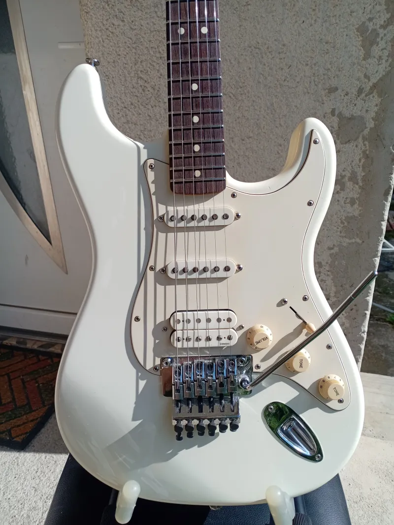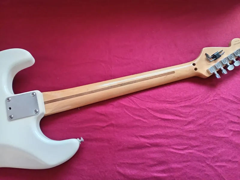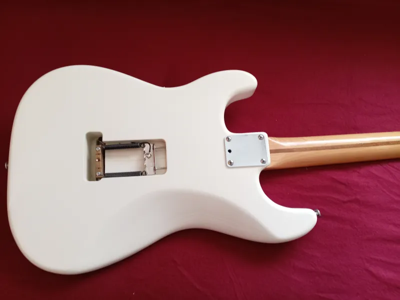 -1.: 2024-ben SHG műhelyében kapott egy mahagóni testet, eredeti Arctic White festéssel.(Egyik fényképen látható.)