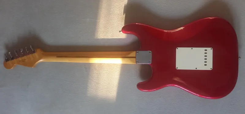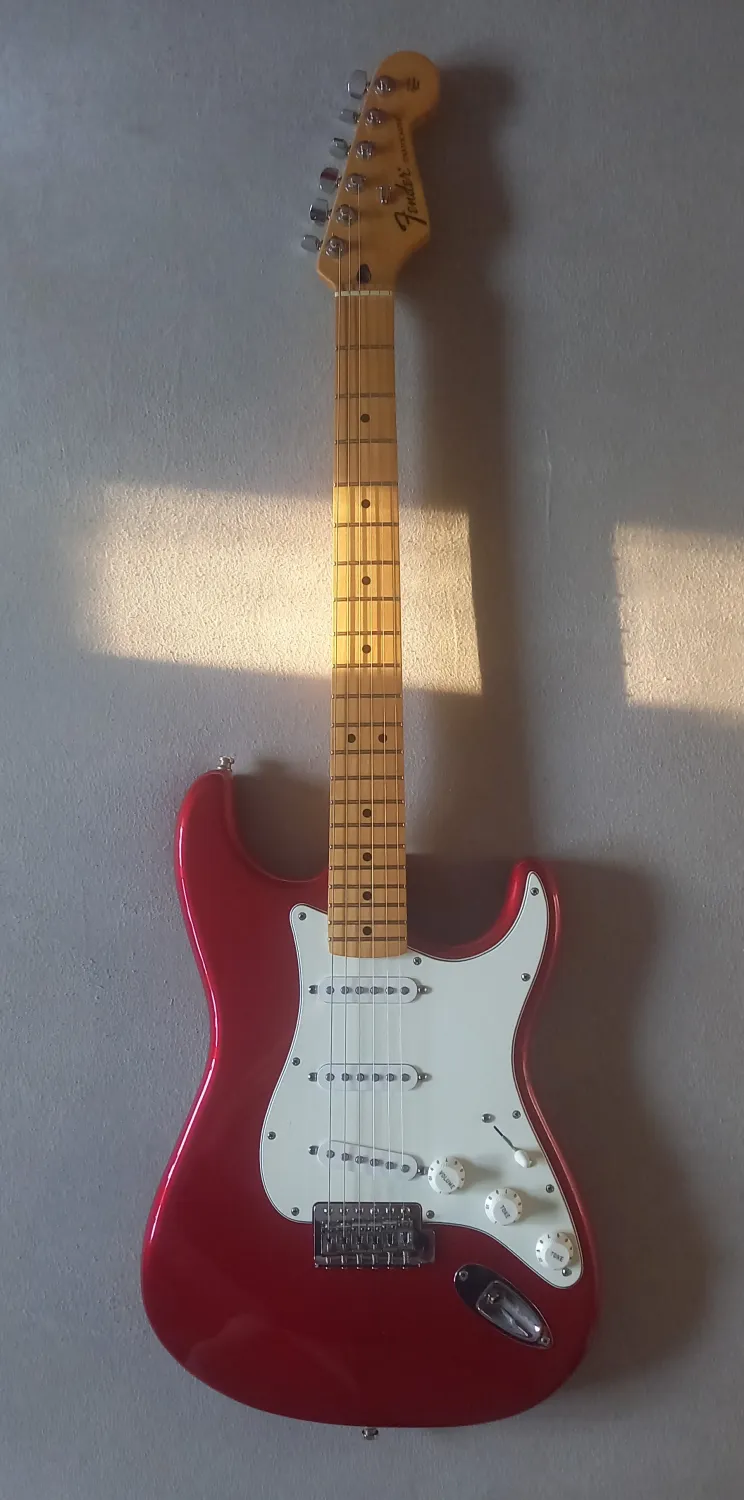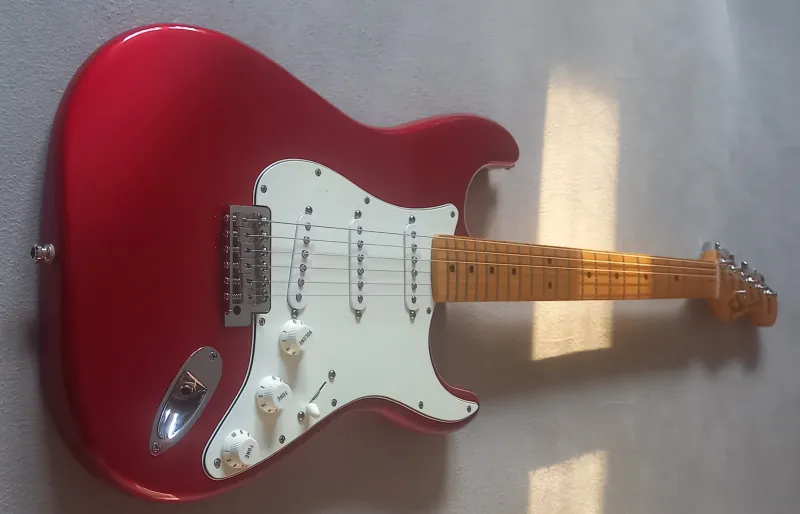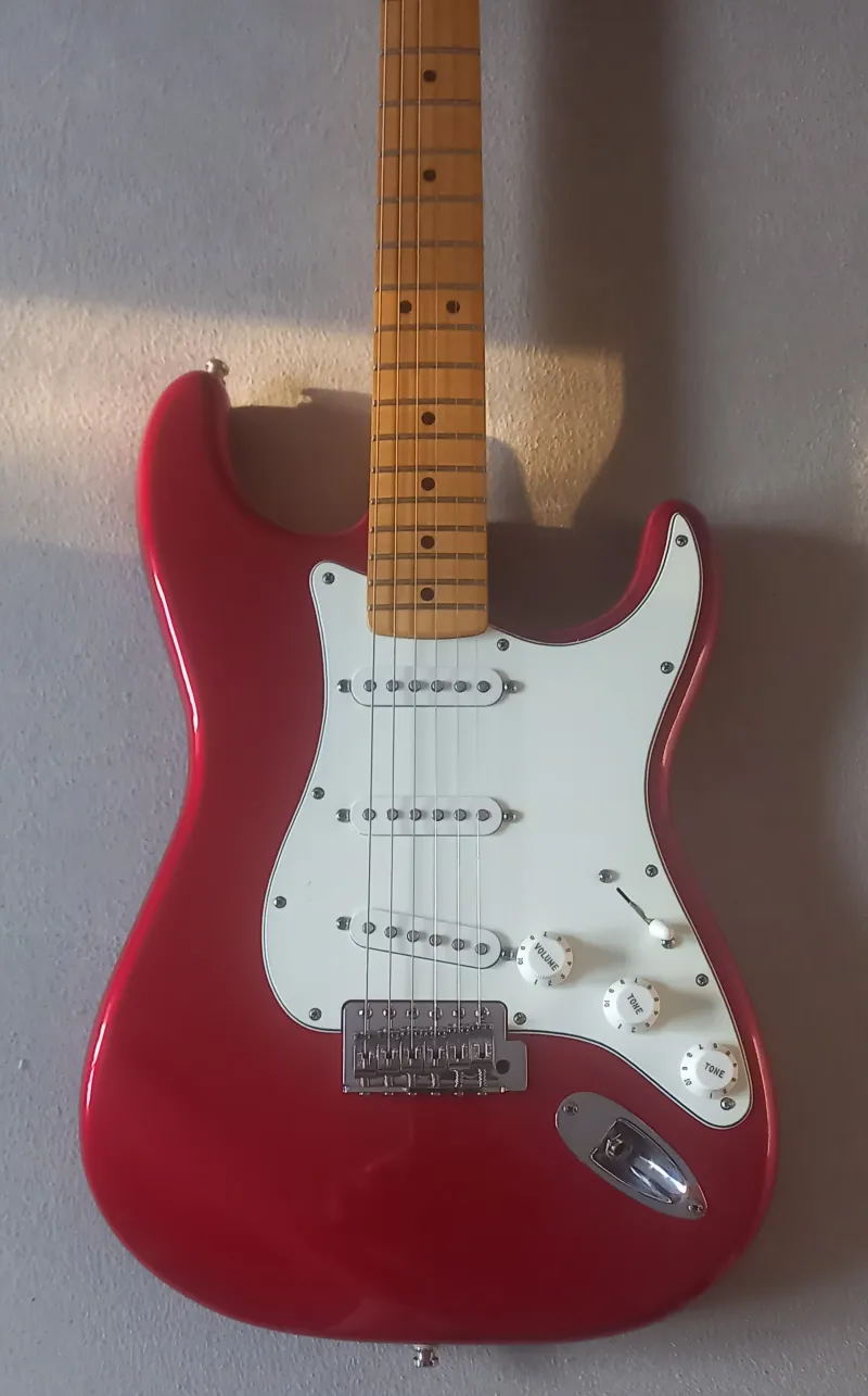2009-es, juhar nyakas Candy Apple Red mexikói Fender Standard strat - gyors gitárállomány-leépítés miatt kedvező áron - eladó.Szép állapotú, megkímélt hangszer, újszerű bundokkal.
