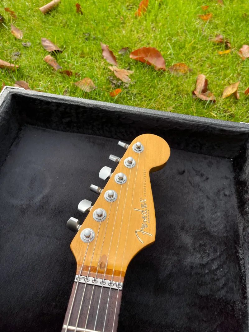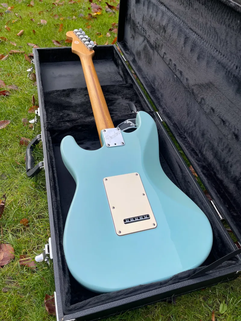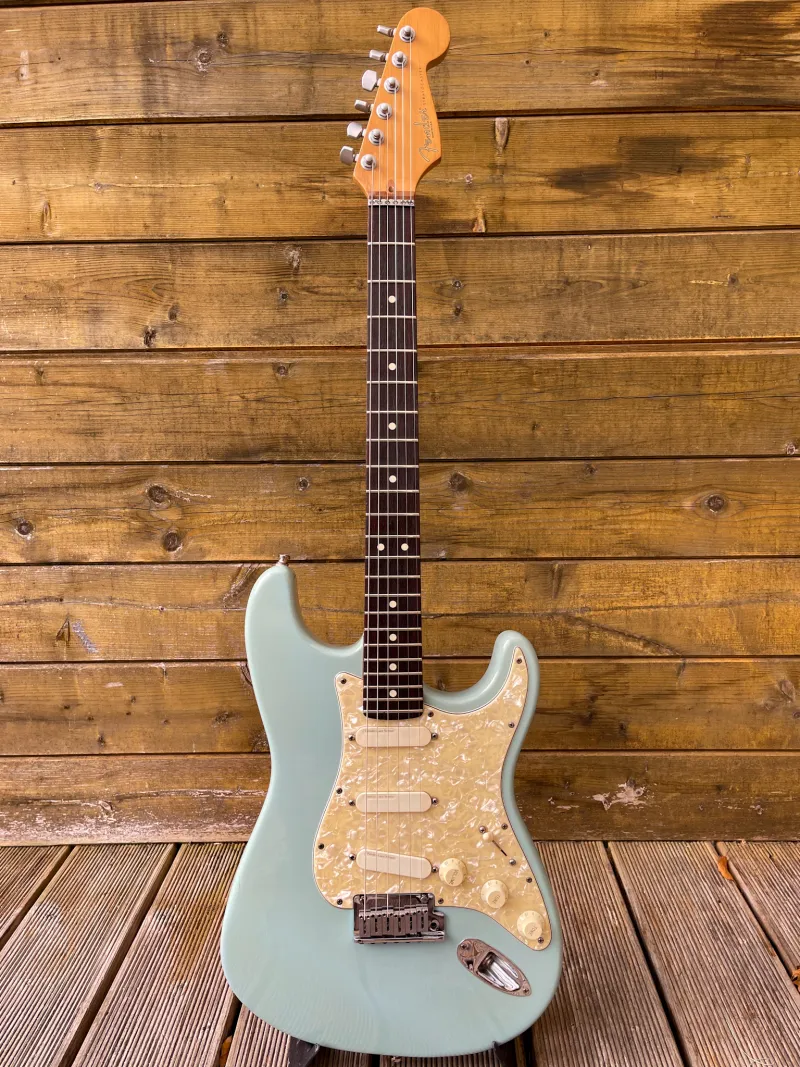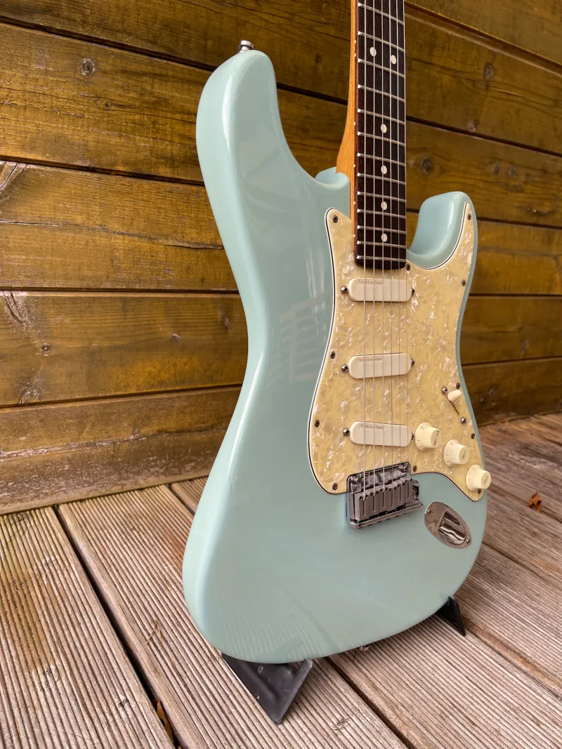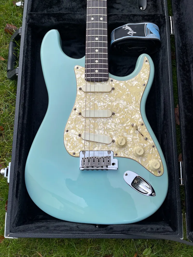 I am selling this beautiful American Stratocaster in the rare Sonic Blue color from 1996. Alder body, maple neck with modern C profile, rosewood fingerboard with 9.5’’ radius, 3x noiseless Lace sensor gold (same as on Clapton, Beck models), TBX bridge (trebble and bass expansion), tremsetter, locking tuners, LSR Roller nut. All original, set-up by my guitar tech. The guitar plays easy and has a nice sparkly tone but also warmth.. Case, tremolo arm, and strap are included. For sale only. Shipping from the Czech Republic, insured and tracked via courier.Versand