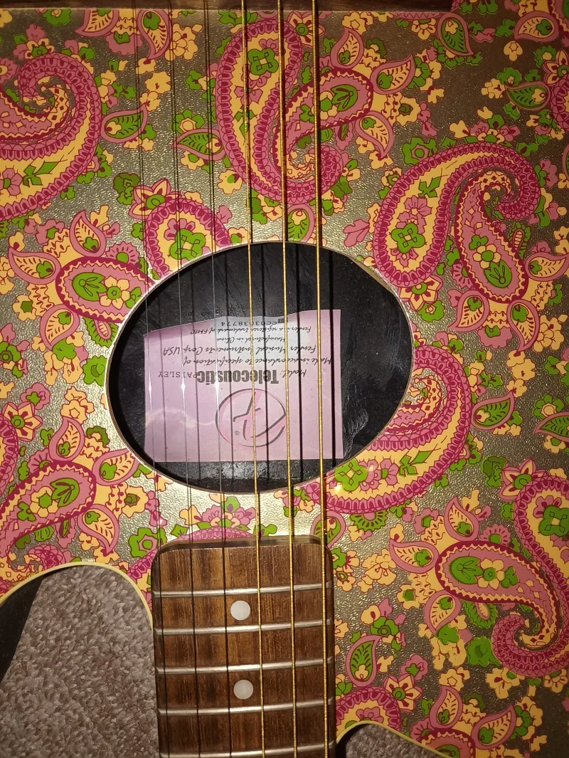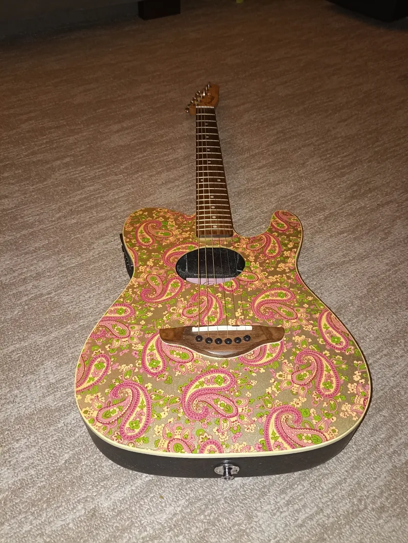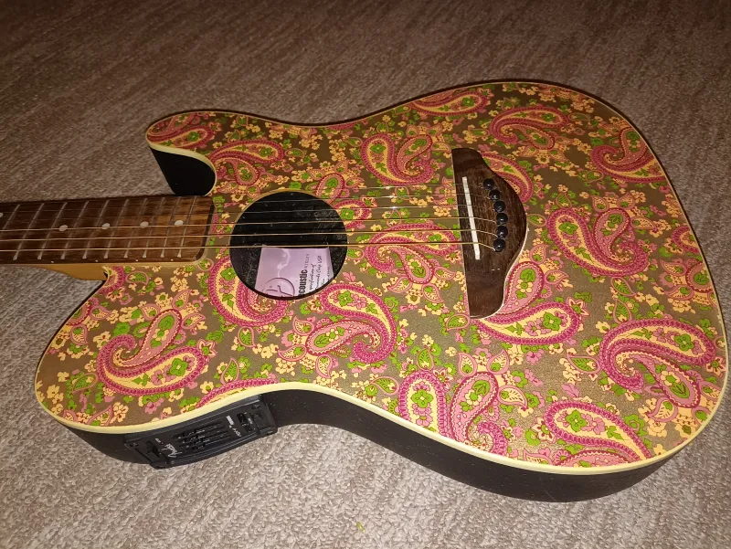 Fender Telecoustic Pink Paisley, 2000-es évek végén Kínában készült, már nem gyártják. Beállítva, új húrokkal. Csere v. beszámítás lehetséges ( elektroakusztikus v. elektromos gitár v. looper érdekel )Verknüpfter Testbericht