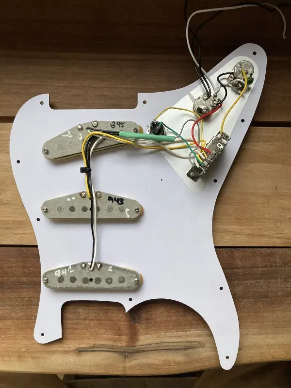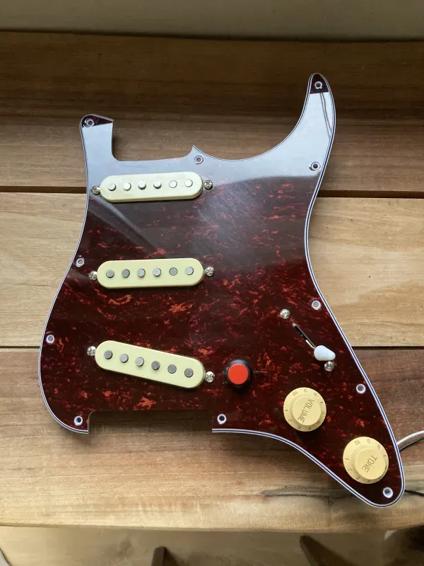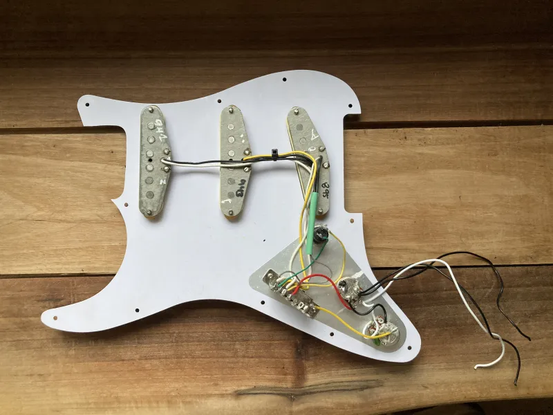 Fender Vintera `60s Vintage Stratocaster Pickup szett, összeforrasztva, a képen szereplő mérsékelten karcos kolbászos koptatóval, fázisfordító kapcsolóval. Utóbbi működési elve az, hogy a nyaki pickup fázisát megfordítja, illetve 1. és 5. állásban híd + nyak, 2. és 4. állásban mindhárom pickup szól (out of phase). Ha ezt kikapcsolod, akkor megkapod a szokásos 5 pickup állást. Középső (3.) állásban nincs hatással a soundra.