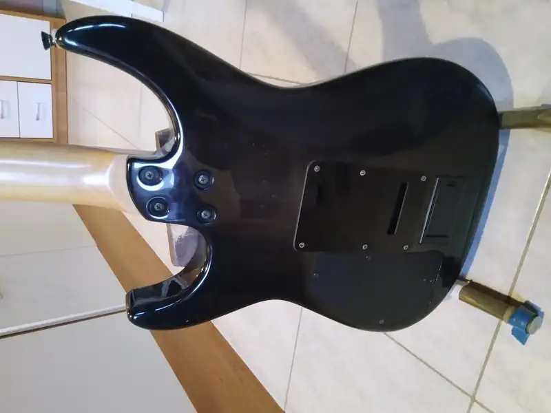 Nagyon szép erezetü a fa, átlátszó sötét szürkés-feketés a festés, gyári. Gotoh kulcsok. Elso poti helyen killer switch, tremolo kar nincs meg, de azt hiszem 5 mm-es tradicionalis Fender-tipusu valo bele. A pengeto tarto alatt a kiszerelt sustainer helye van, hatul az elemtarto is ahhoz tartozott. Ha valaki aktivkodni akar, az felhasznalhato egy aktiv pickup meghajtasahoz.