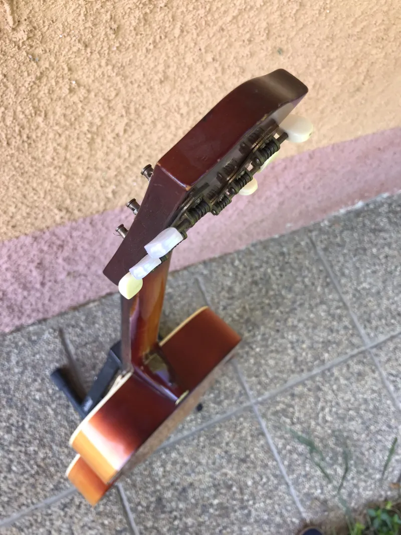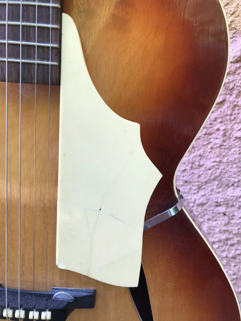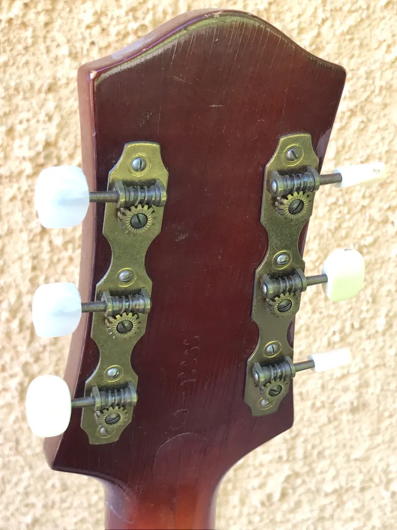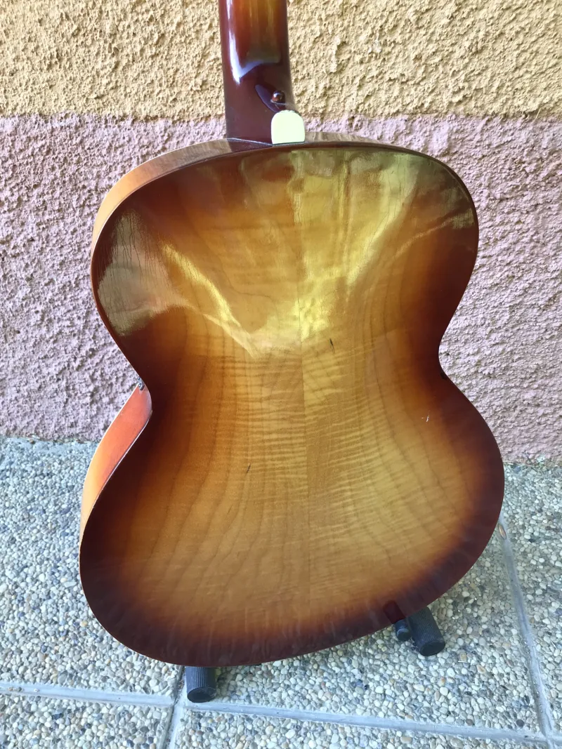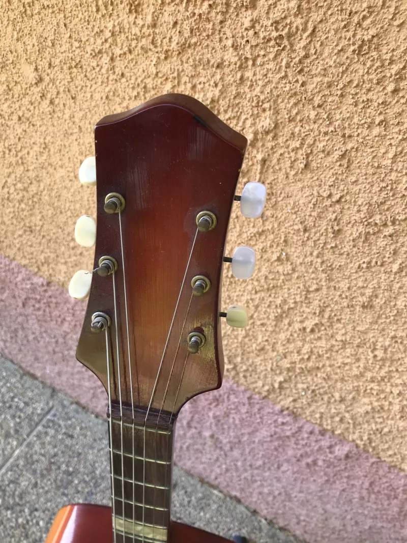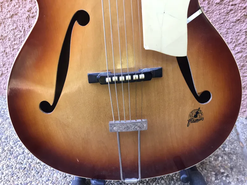 Framus archtop gitár, feltehetően az ötvenes évekből. A pickguard sajnos ragasztva van, és néhány hangolókulcs feje letörött, melyeket hasonló újakkal pótoltam. A vászontáska eredetinek tűnik.Versand