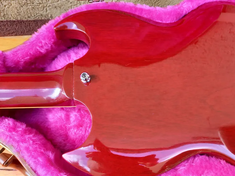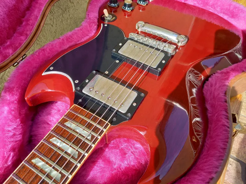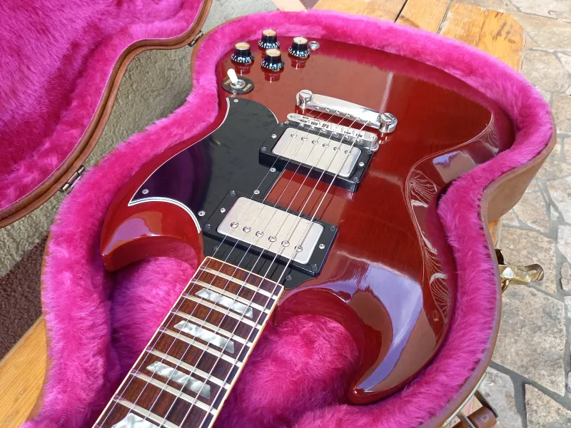 Ez egy igazi ritkaság, gyűjtői darab! 1986-os Gibson SG62` Re-issue Tim Shaw Shawbucker hagnszedőkkel, gyári keménytokjával. Korának megfelelő állapotban. Egyedül a hangoló kulcsok lettek cserélve Shaller vintage típusúra. Ezen kívül minden porcikája eredeti. Bundozva soha sem volt, és nincsen is rá szükség. A gitártok nincsen lelakva, nagyon szép állapotú.