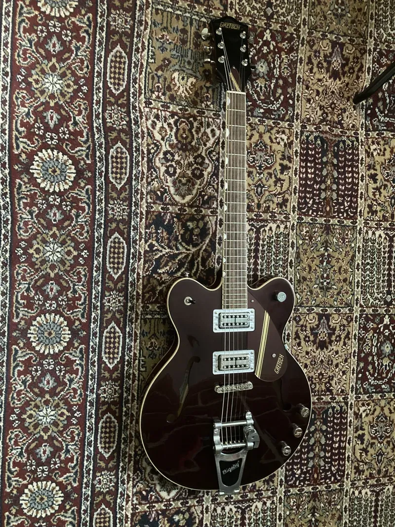 Gretsch G2604T Streamliner™ Rally II, oxblood színben. A nyaknál egy TV Jones PowerTron, a hídnál egy TV Jones Classic Plus, de az eredeti Super HiloTron pu-kat is adom, csakúgy, mint az eredeti potisapkákat. Bigsby-kar természetesen szintén megvan, csak leszerelve.Verknüpfter Testbericht