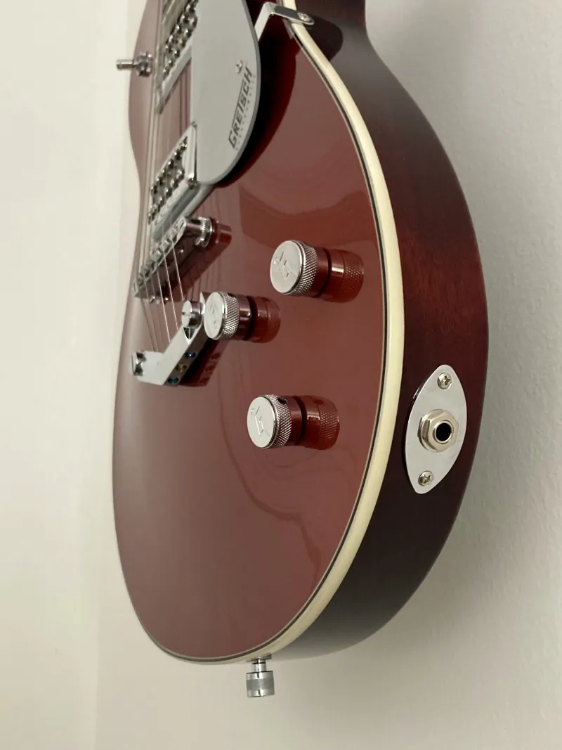 Kamrás mahagóni test juhar toppal, ragasztott nyak, 22 Medium jumbo bund, modern “thin U˝ nyakprofil, babér fogólap, fehér binding, króm hardverek, Black Top Broad`Tron humbucker hangszedők, és a szokásos Gretsch potik.