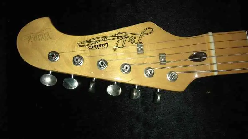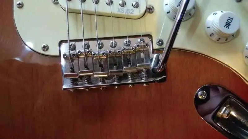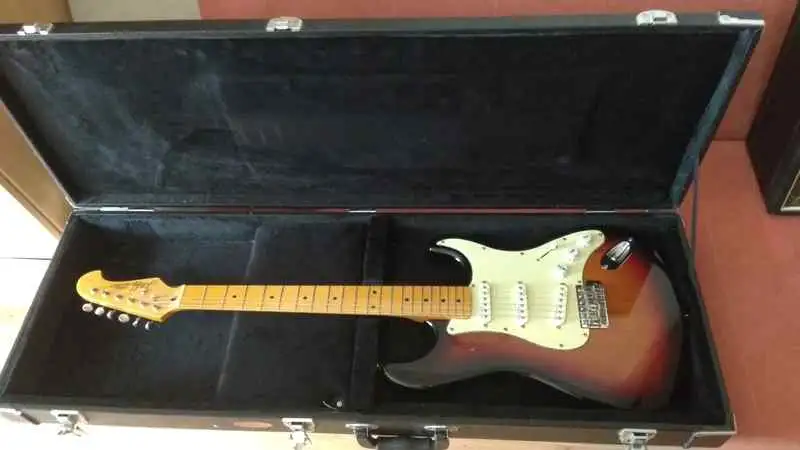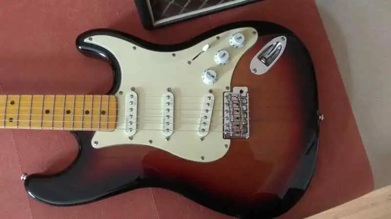 Das Instrument wird regelmäßig gewartet (Verstehen Sie das gut!), frei von Beschädigungen und Gürtelschnallenspuren. Es gibt nur wenige kaum wahrnehmbare Haarkratzer durch Gebrauch. Die einzigen Änderungen gegenüber dem Werkzustand sind, dass die Tonabnehmer- und Klinkenbuchsen mit Kupferfolie abgeschirmt wurden, was die Tonabnehmer in den Schalterpositionen 1-3-5 weniger geräuschvoll macht, und der "Tremolo"-Block ist gedrosselt (kann in ca. 3 Minuten wiederhergestellt werden). Gurtpins wurden durch Gurtverschlüsse ersetzt. Der Tremoloarm ist vorhanden.