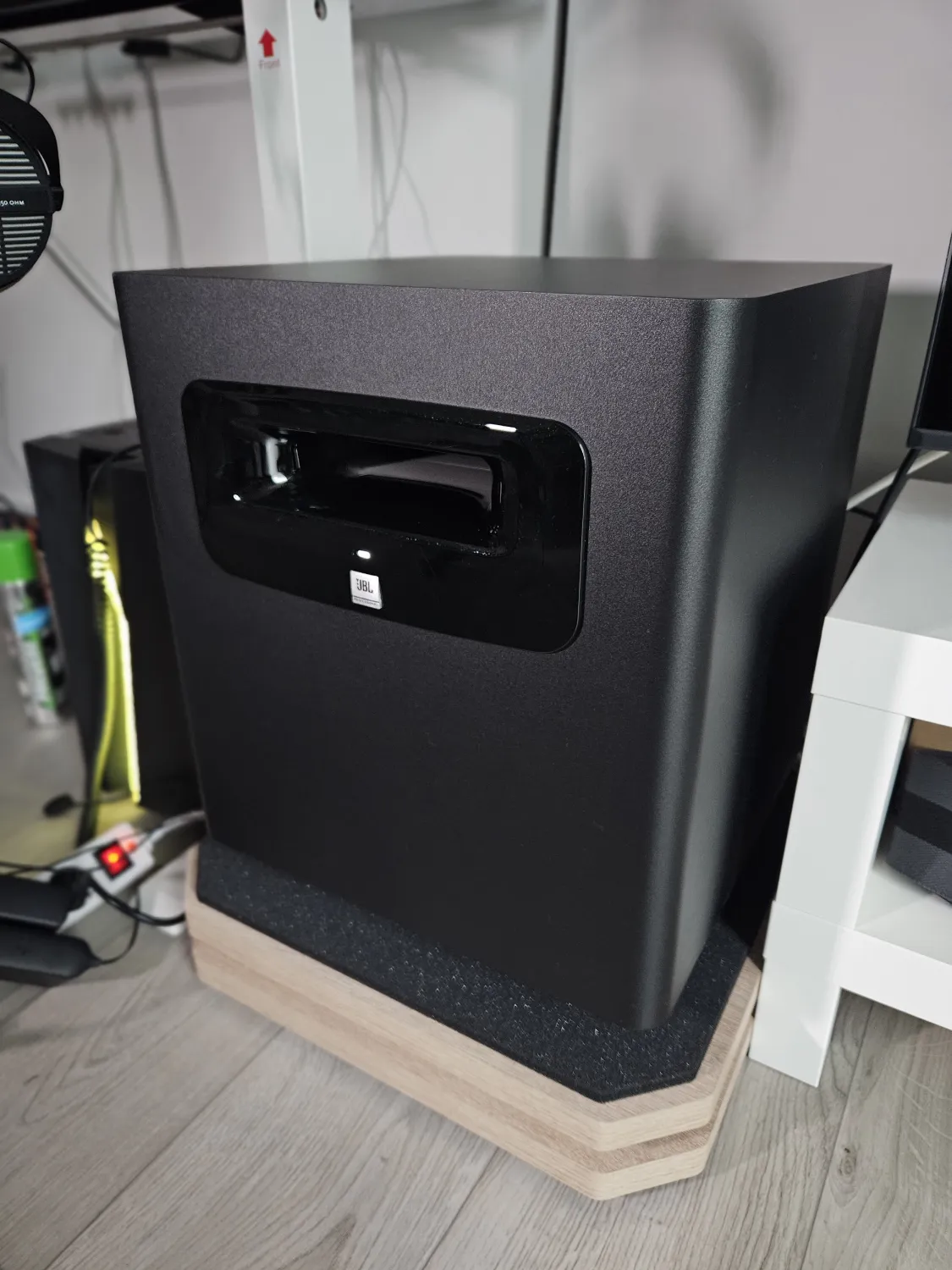 -1 db JBL LSR310S aktív mélynyomó: 200W, lefelé sugárzó 10˝-os driver, beépített hangváltóval.