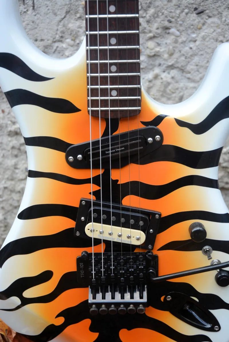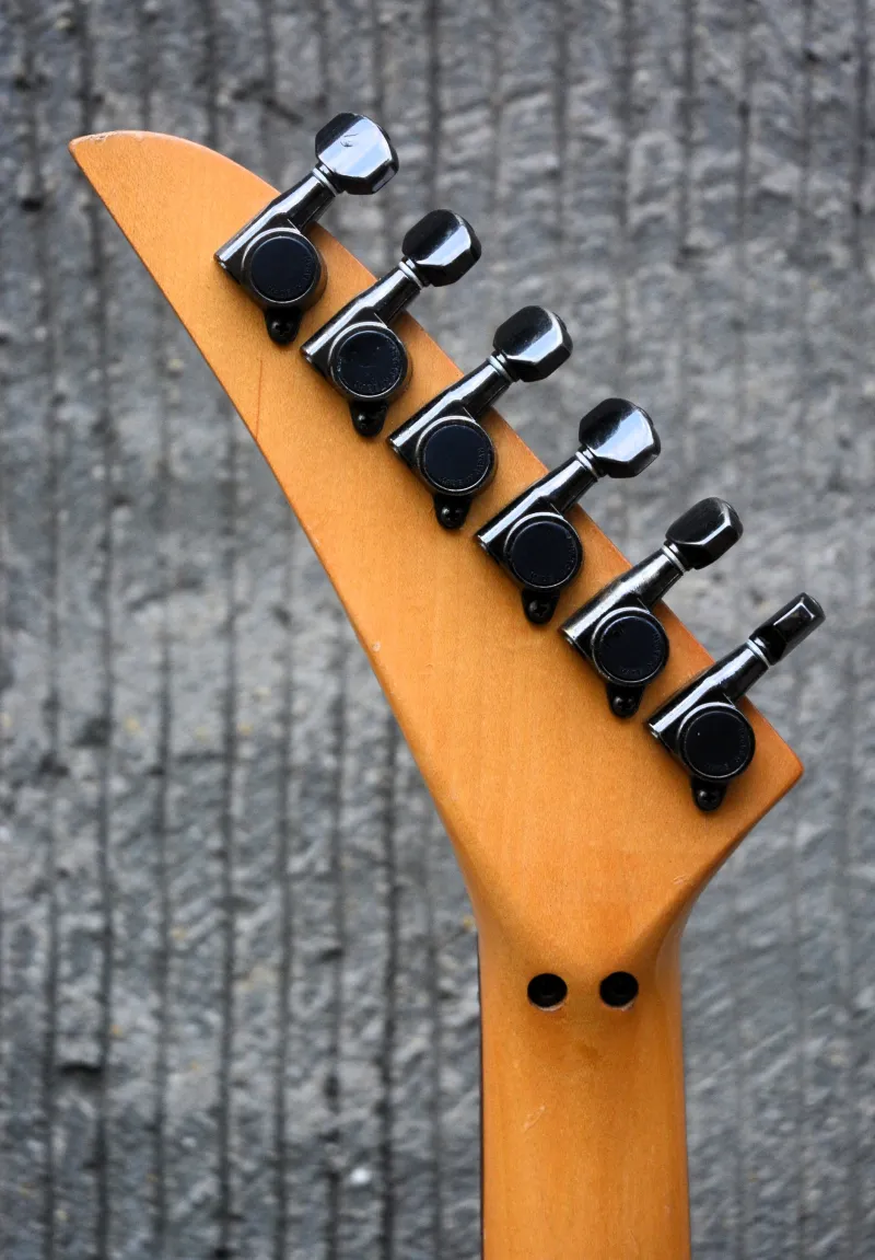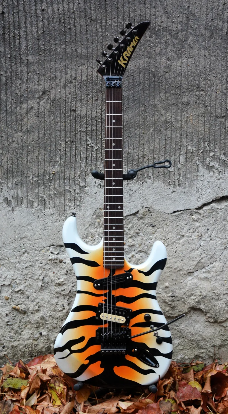 Kramer Pacer elektromos gitár a `80-as évekből. Specifikáció: Takeuchi TRS-101 Japán nagyblokkos tremoló, hídnál Seymour Duncan TB-4 Trembucker, nyaknál Seymour Duncan Hot Rails SHR1N hangszedő, Gotoh hangolókulcsok. A test finish eredeti, de kapott egy új lakkozást. A hídi humbucker kapcsolóval felezhető, a másik kapcsoló pedig 3 állású pickupváltó, illetve kill switch gomb is van még a gitáron. A márka széttartó szériaszámozása miatt a gyártás pontos évét és helyszínét nem tudtam kideríteni, de a karakter alapján japán, vagy koreai.Verknüpfter Testbericht