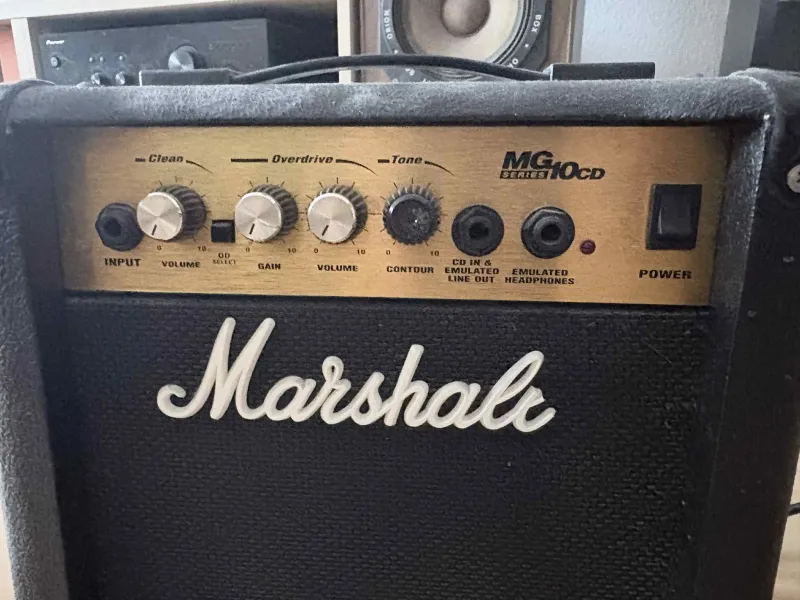 Eladó Marshall MG10CD tranzisztoros 10 wattos erősítő, sokat használt próbateremben és otthon is. Kiváló gyakorlóerősítő.Az állapotát tekintve meglehetősen kedvező áron adom, a potik néhol már recsegnek és a külsején is látszik a kora.