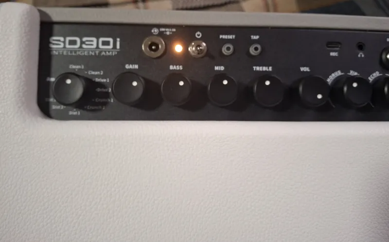 Erősítő, Gain, basszus, közép, magas hang, hangerő, chorus/vibrato, visszhang/delay, hangszer és audio vezérlők
