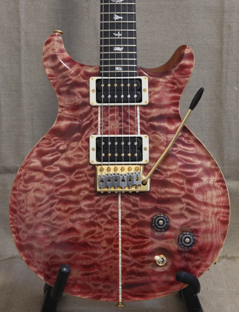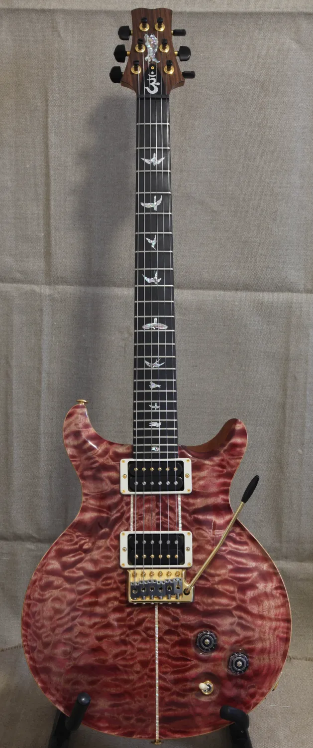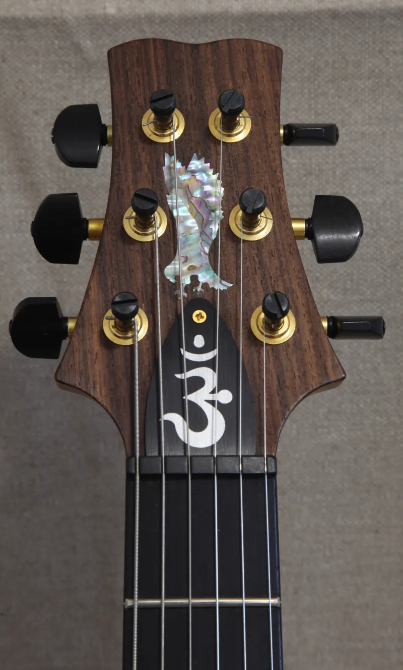 Kiváló állapotú , 2014-es PRS Santana Wood Library. Mahagóni test, pikkelyes juhar top, csíkos jávor nyak, ébenfa fogólap , kagyló madár jelölők gyöngyház kontúrral, kagylóból készült sas a fejen, ébenfa hangoló kulcs gombok. Most Dragon I hangszedők vannak a gitárban, de az eredeti felezhető Santana hangszedőkkel adom tovább.Verknüpfter Testbericht