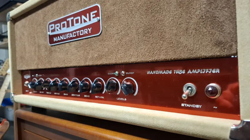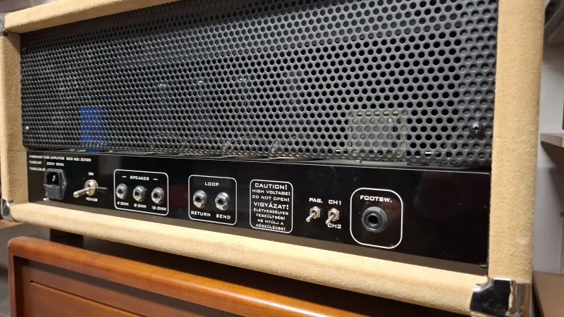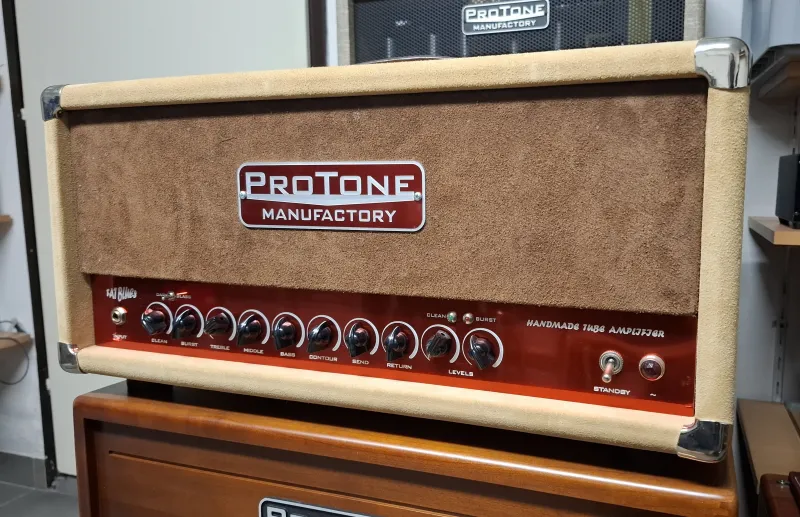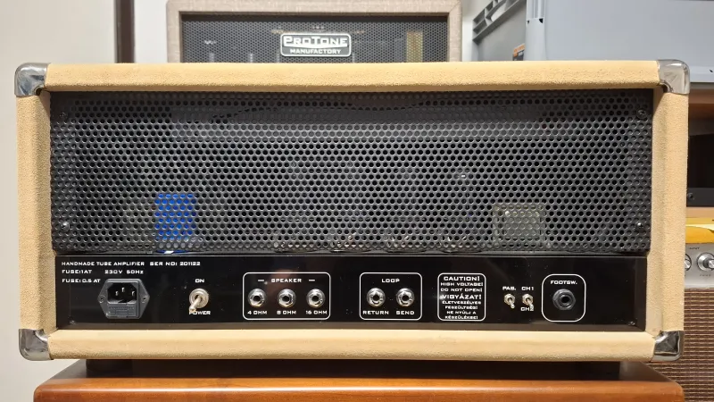 Eladó egy eredeti Protone Manufactory Fat Blues csöves 100W-os gitárerősítő-fej. Lőrincz Attila által fejlesztett és általa kézzel épített, nevéből is adódóan elsősorban blues és klasszikus rockra készített erősítő. 4, 8 vagy 16 Ohm-os kimenettel, 2 kapcsolható csatornával, igényes velúr bőr bevonatú dobozzal és előlappal.Bemutató darab, mindvégig Lőrincz Attila tulajdonában volt, alig használt.