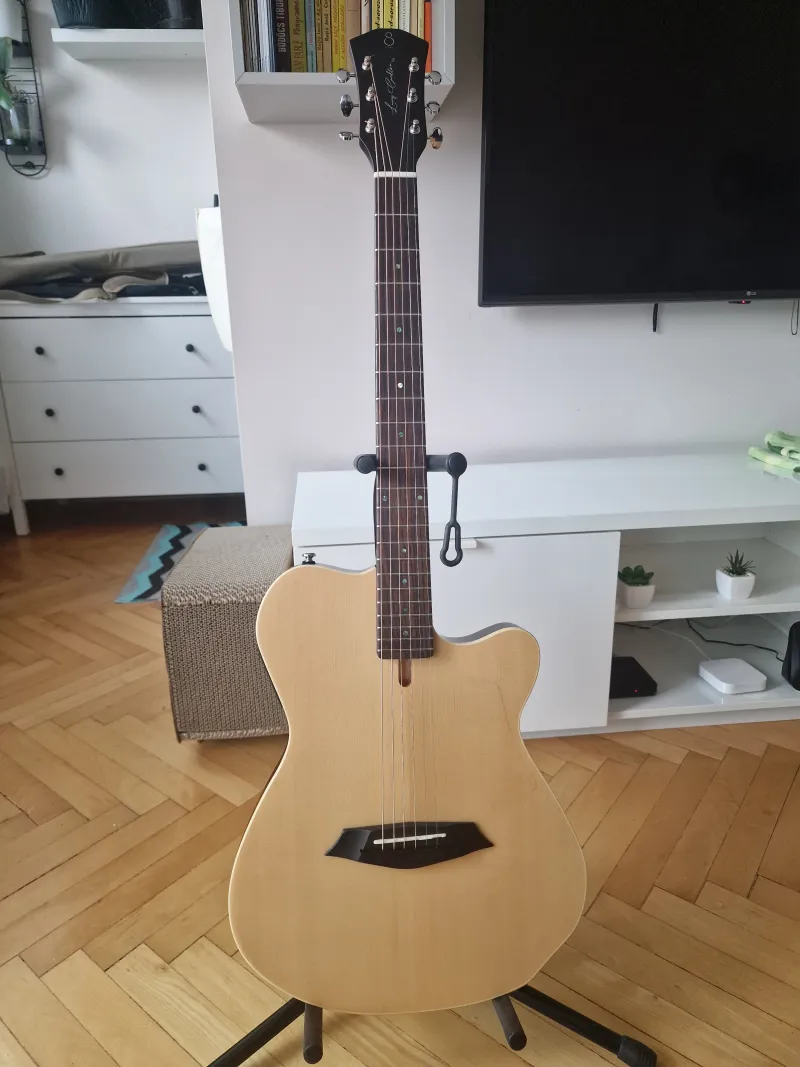 Eladó egy Sire Larry Carlton akusztikus koncert gitár (fémhúros). A hangszer kapott egy átlátszó koptatót. A húrmagasság alacsonyra lett állítva (shimerrel), így igény esetén könnyen visszaállítható. Igény esetén Fender puhatokkal (+20 eFt).Verknüpfter Testbericht