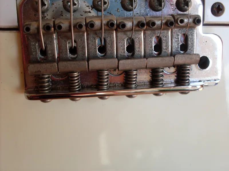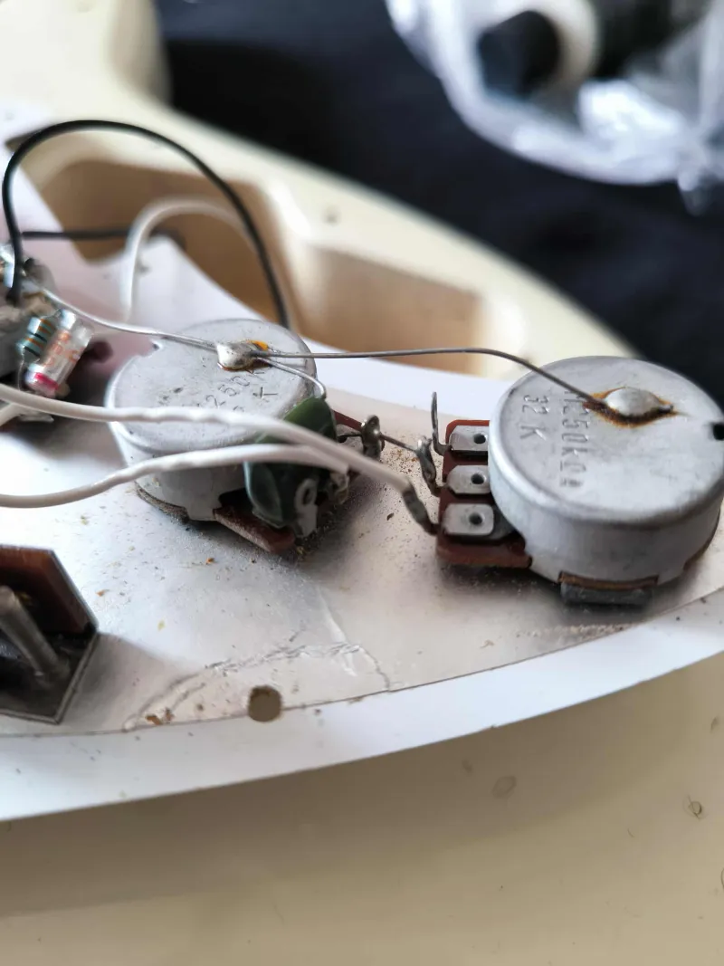 A gitár jó, eredeti, állapotban van, kivéve az új bundozást, meg valami rá van forrasztva a hátsó hangszedő potijára (az eredetire), egy kondi+ellenállás, szerintem vágja a magasakat, de nem értek hozzá.Hangszedők USA Fullerton Black Bobbin, DM 3 állású váltó, japán elektronika. Pont mint a gyári specifikáció. Megpróbáltam beazonosítani, vagy 62-65 vagy 62-85. A nyakzsebbe a 65-nél C a 85-nél B jelzést írtak. Ebben mind a kettő benne van. 1983-as gyártás Fujigen. A hátsó takarója nincs meg.
