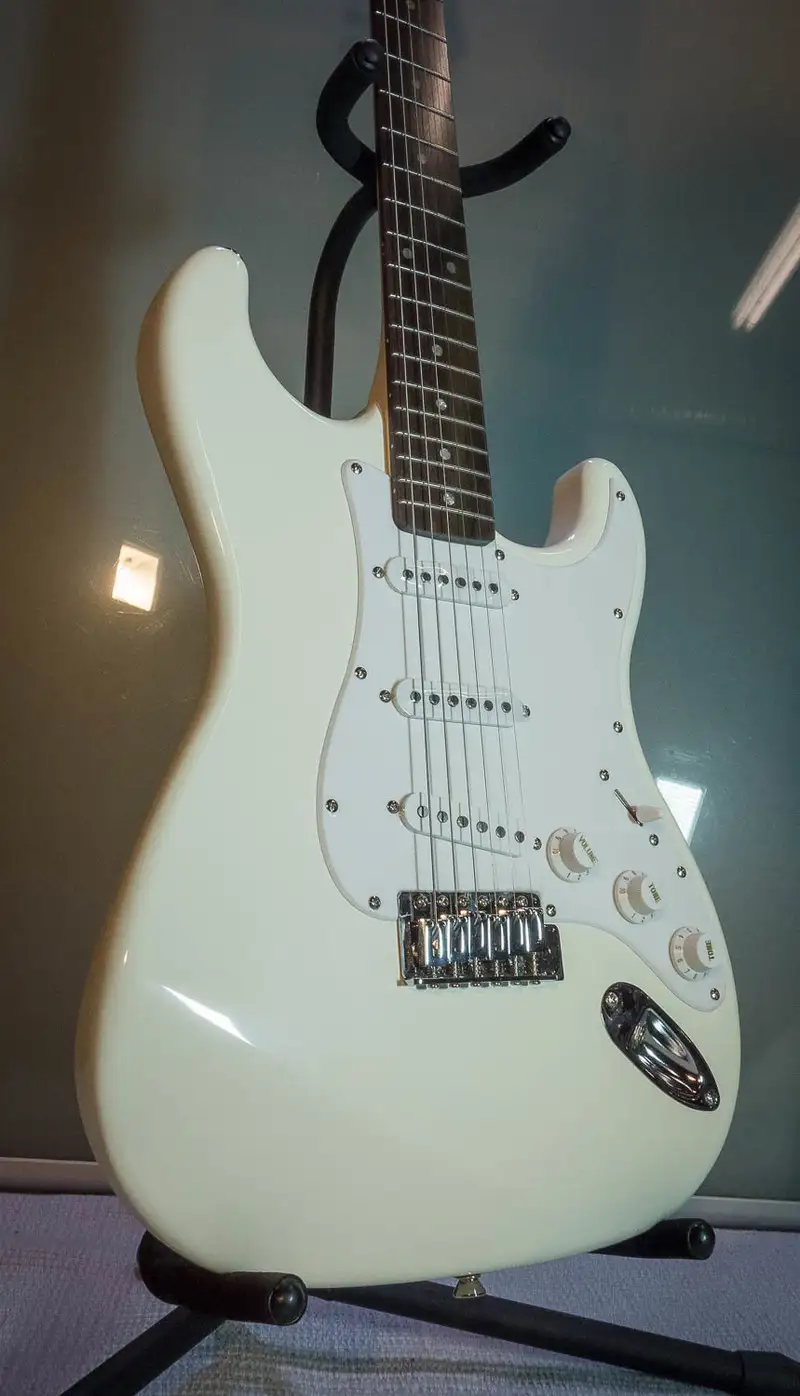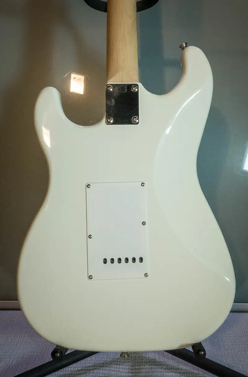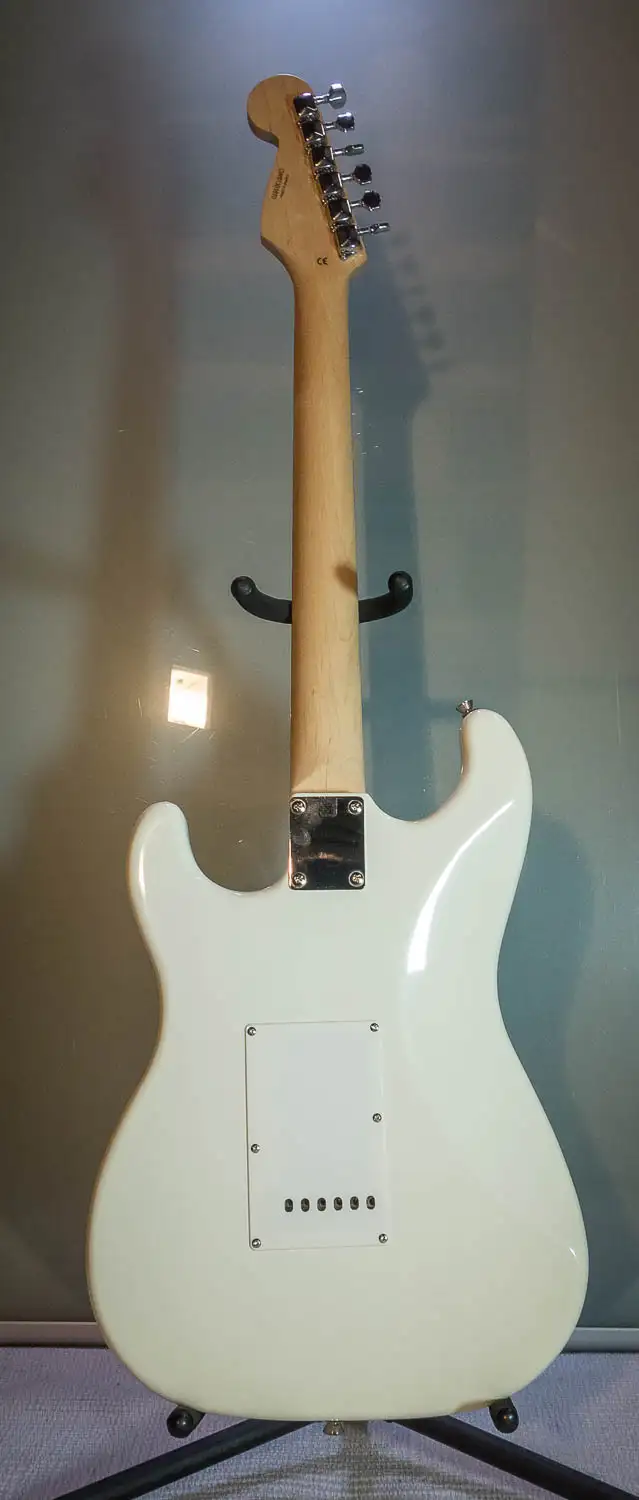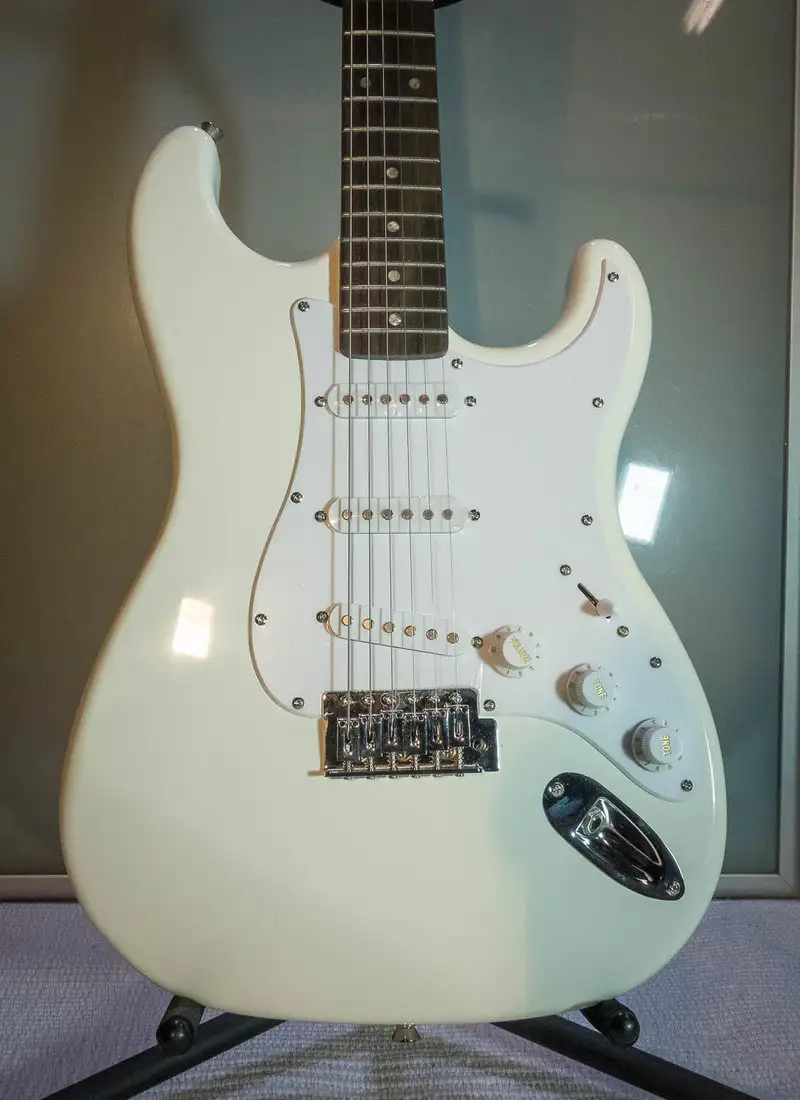 Merkmale: Korpus: Linde Hals: Ahorn Tonabnehmer: 3 x Single Coil, 5-Wege-Schalter Potis: 1 Volume, 2 Tone Farbe: Vintage White
