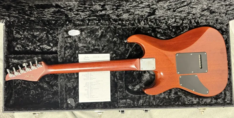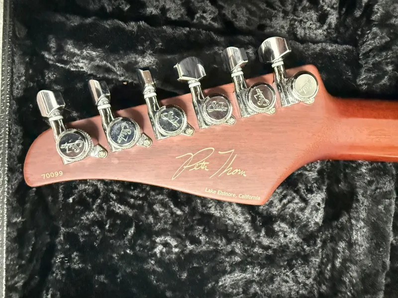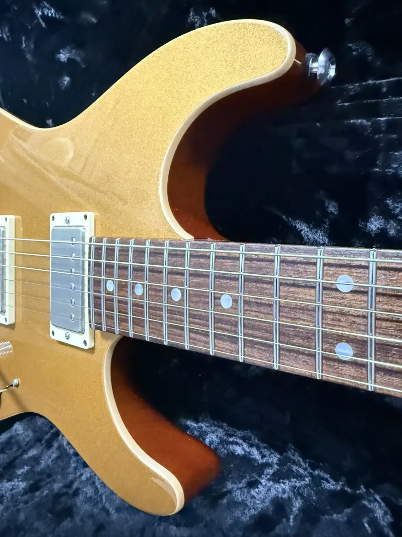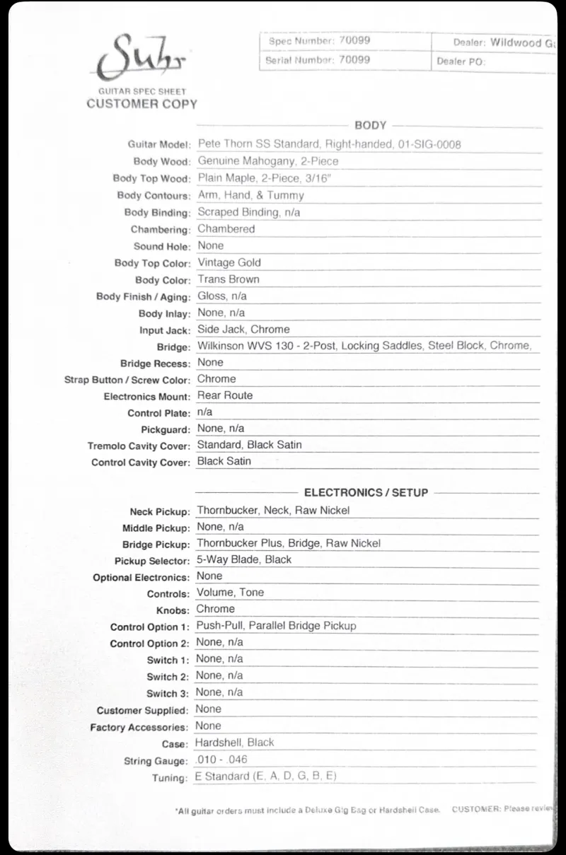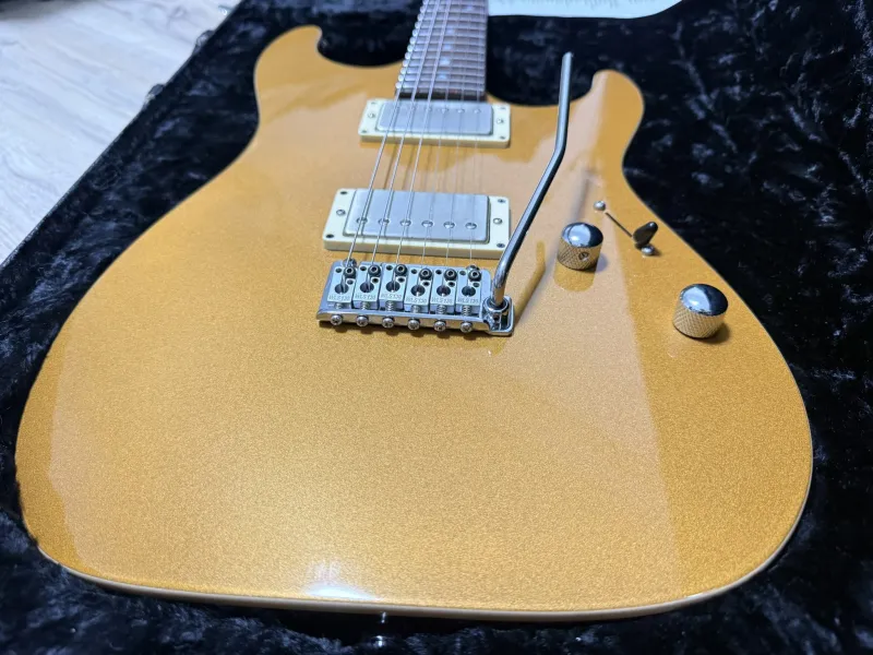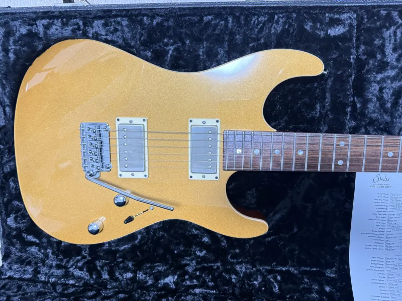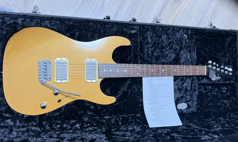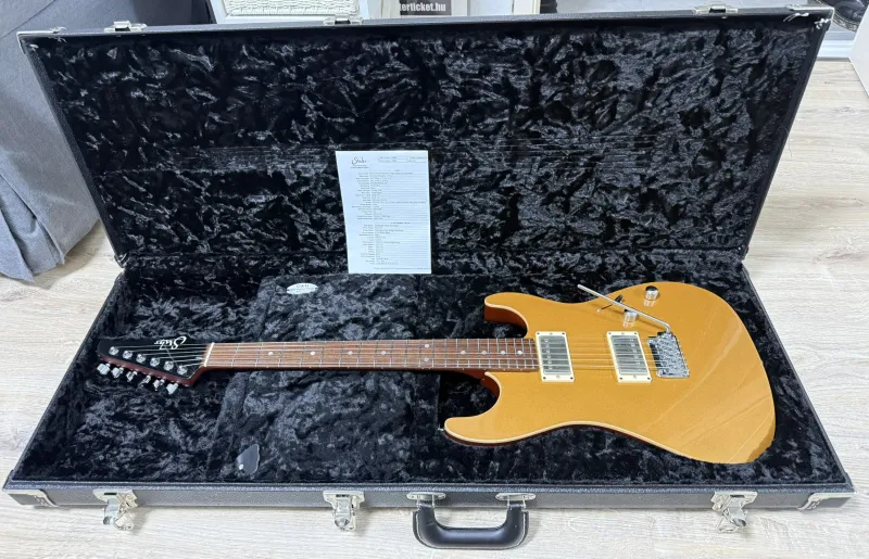 Eladó a képeken látható, makulátlan állapotú, 2022.12.22.-én gyártott Suhr Pete Thorn SS Standard GOLDTOP gitár. Mindenféle karc- és leverődés mentes, gyönyörű, csillogó gold (juhar) top, üreges mahagóni test, binding, Wilkinson WBS 130 híd, acél blokk, satus nyereg, Thornbucker pickupok, 5 állású pu.váltó, push-pull poti, indiai rózsafa fogólap, acélmentes jumbo bundok, Mother of Pearl jelölők és logo berakás, Suhr Locking hangolók.Pontos, mint az atomóra, elképesztő minőség, feel és sound. Gyári keménytok jár hozzá. Kizárólag személyes átvétellel, postát nem vállalok.