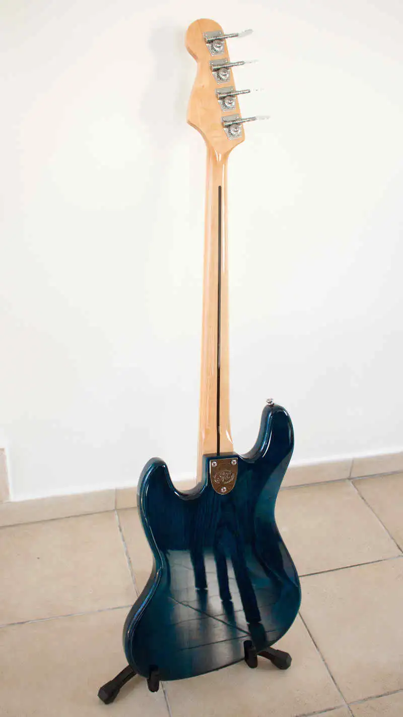 Geschraubter Hals, Eschenkorpus, Ahornhals, Mensur: 34 Zoll (86,36 cm), Ahorngriffbrett, 20 Jumbo-Bünde, 2 x J-Style Tonabnehmer, 2 Volume, Tone, Chrom-Hardware, Vintage Style Stimmmechaniken, Trans Blue Finish.