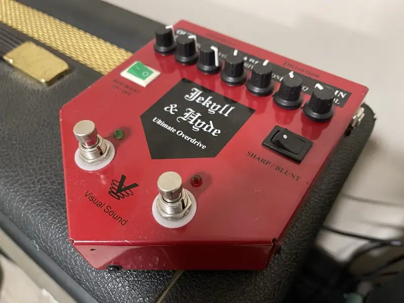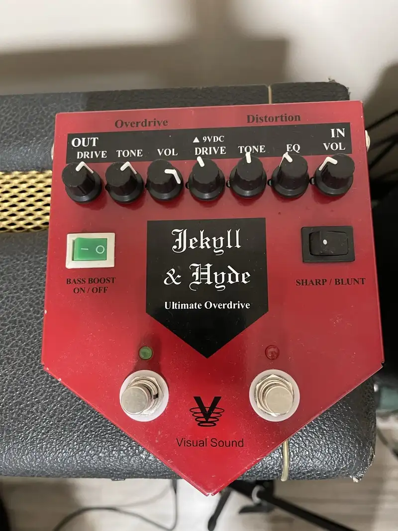 Eladó egy szép állapotú Visual Sound Jekyll & Hyde V1 torzítópedál.Ez a Made in USA pedál két oldallal rendelkezik, az Ibanez TS és a Marshall Shredmaster pedálok hangjait szólaltatja meg rengeteg további szabályozási lehetőséggel (élesíthető/tompítható és bass boostolható a hang). A két pedál egymásra is stackelhető, így akár egy pedálból lehet tiszta erősítőn is high gain szólóhangot kapni. A V1 verziót sokan jobbnak tartják mint a későbbi verziókat.