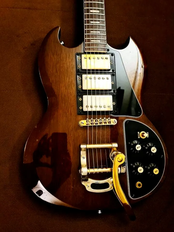 Eladó a fent emlitett gyönyörű és csodálatos ritkaság! Az 1974-es SG Custom nagyon ritka példánya. 1972 volt az egyetlen év, amikor G ** fia elkészítette az SG-t az elülső kezelőpanellel és a Les Paul stílusú pickguarddal a 3 pickup konfigurációval együtt. Rendkívül jól szól!Igazi csemege! Gyönyörű Nagy nyitott tulipán Gibson os fej nagyon szép intarzia berakással és bindingfel!A csavarozott nyak senkit netévesszen meg az előitéletes berögzült véleményekkel, bármikor összehasonlitható egy ragasztott nyakúval! Ezt előre megjegyzésként,leírom!:)Rendkívül jó állapotban,mindene eredeti!Gyári Bigsby, eredeti görgős hídjával.Test full mahagóni nyak mahagóni rózsafa fogólap nagyon kényelmes!