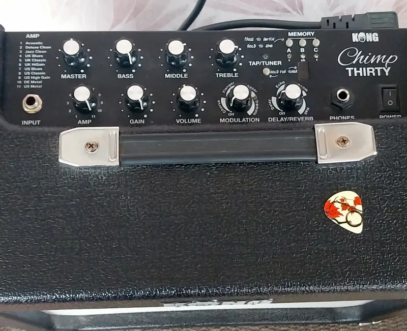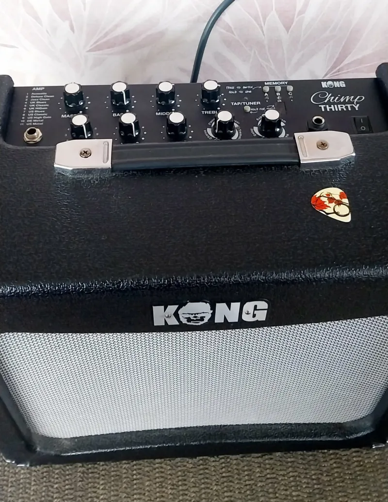 Új állapotú minőségi 30 Wos effektes,modellezős kombó eladó..30 W Channels: 1 Loudspeakers: 1x 8˝ EQ: Bass/mids/treble Effects: Effects Processer Headphone output with speaker mute: yes Special Features: AUX In, Tuner, Tap Tempo Dimensions (Wxhxd): 40,0 x 38,5 x 20,0 cm Weight: 8,7 kg Optional accesories: Kong FS-2 2-way Momentary With the Chimp Thirty, Kong has a versatile, handy modeling combo with extensive features in its range. The 30-watt combo offers 11 amplifier and 11 effect modelings, and your own sound creations can be stored in 3 user memory locations. An optional footswitch can be used to switch through the memory locations