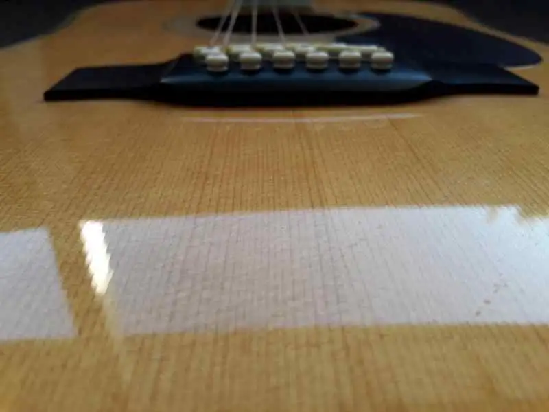 Ebony bridge... with a compensated saddle, which keeps it in tune even in higher positions.