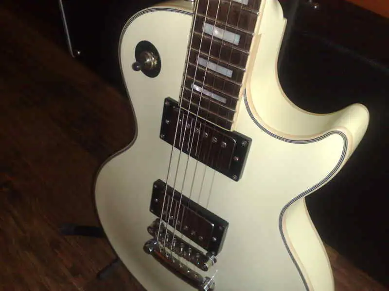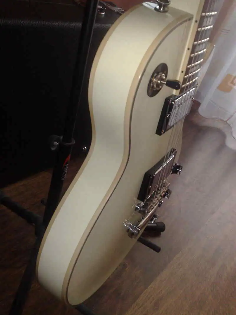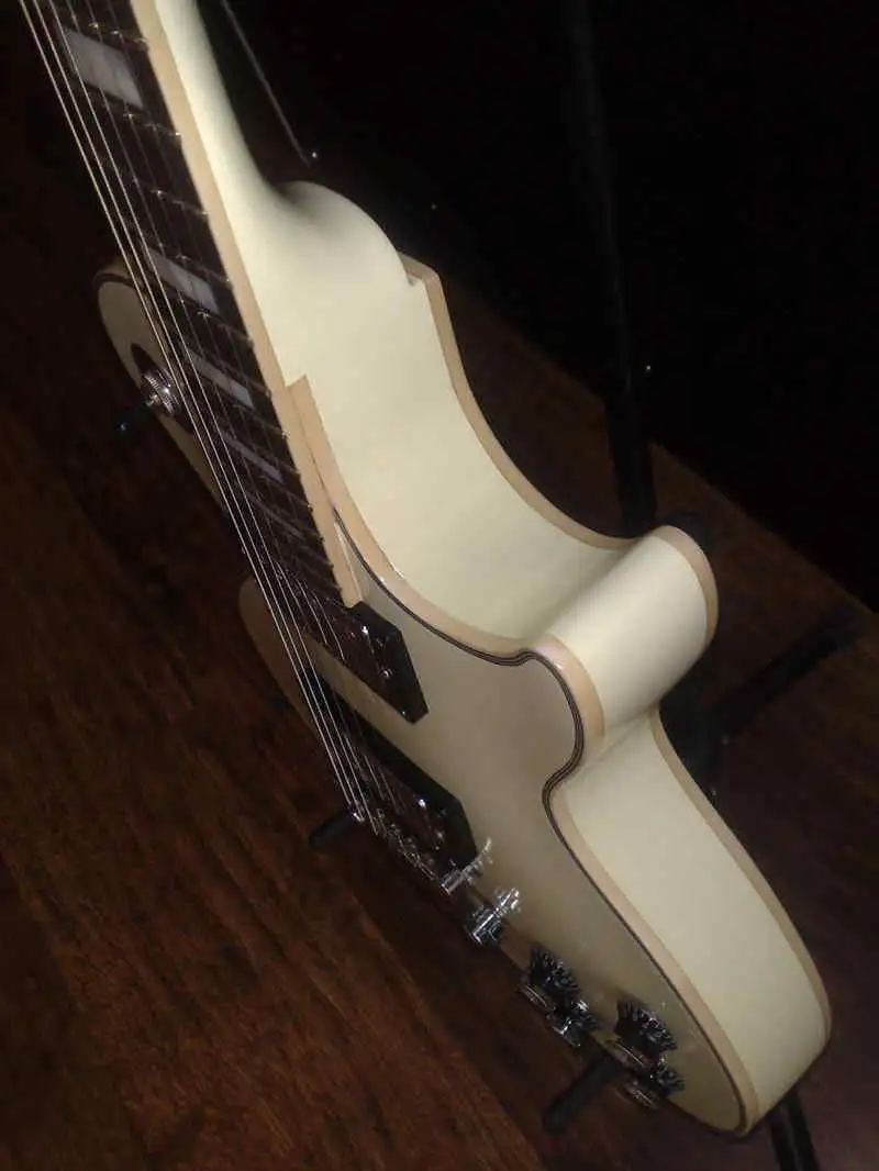 If it bothers someone, the lettering and lacquer can be removed with simple thinner. The original logo+inlay is intact underneath... The only tuning it has is a Bare Knuckle Emerald set, whose neck pickup is splittable, with a Push Pull pot. I can provide a soft case for it.