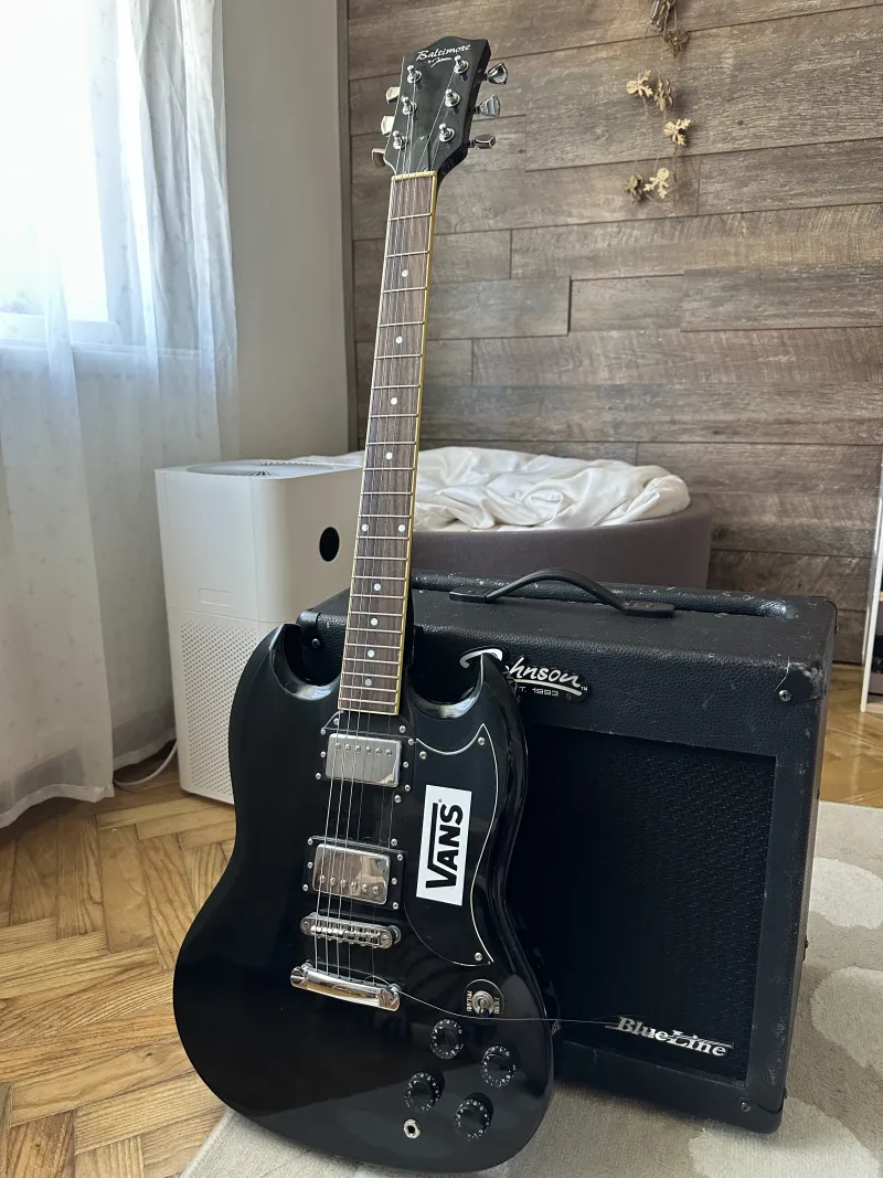 Eladó egy Baltimore by Johnson fekete elektromos gitár és egy Johnson BlueLine erősítő szettben.