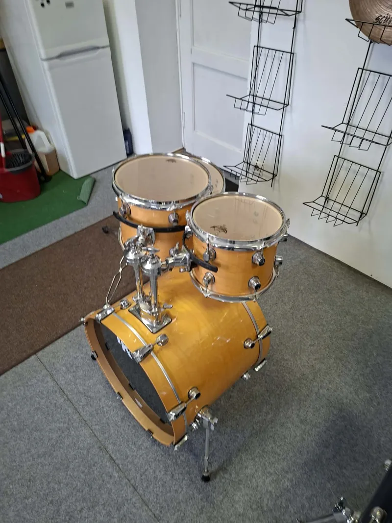 Nyírfa dobtestek, 10 és 12 felső és 14-es oldaltam, fúratlan kivitelben, gömbcsuklós felfüggesztéssel. A lábdob 20-as méretű.