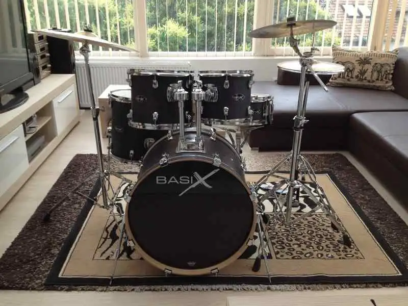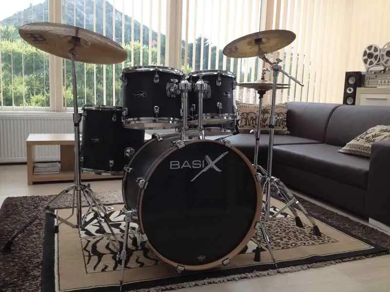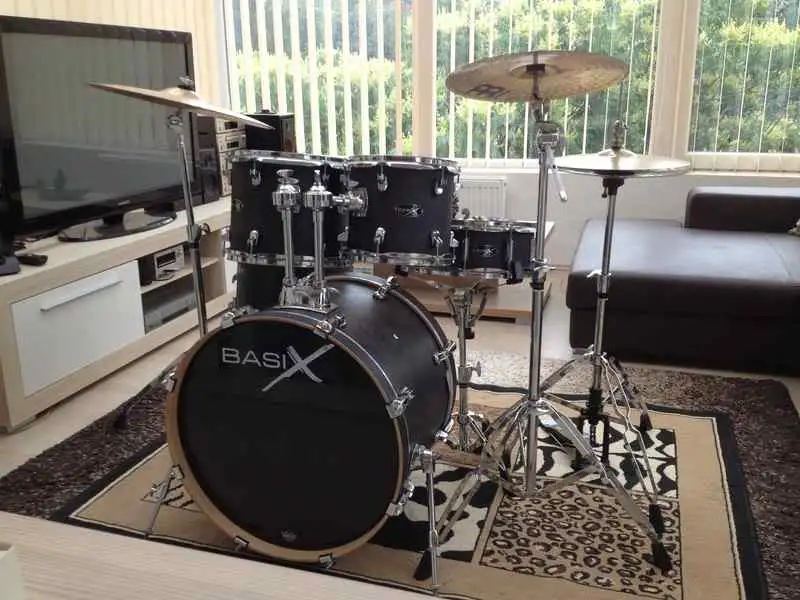 huendeskesLike-new condition BASIX XENON fusion drum set, matte black with beautiful wood grain lacquer finish, 6-ply poplar/basswood drum shells: 22-10-12-14-14˝ bass drum with 10-lug snare with REMO heads, very sturdy, stable HH 600 series 5-piece hardware set and a complete MEINL Headliner Brass 14-16-20 cymbal set, with a free drum throne!
