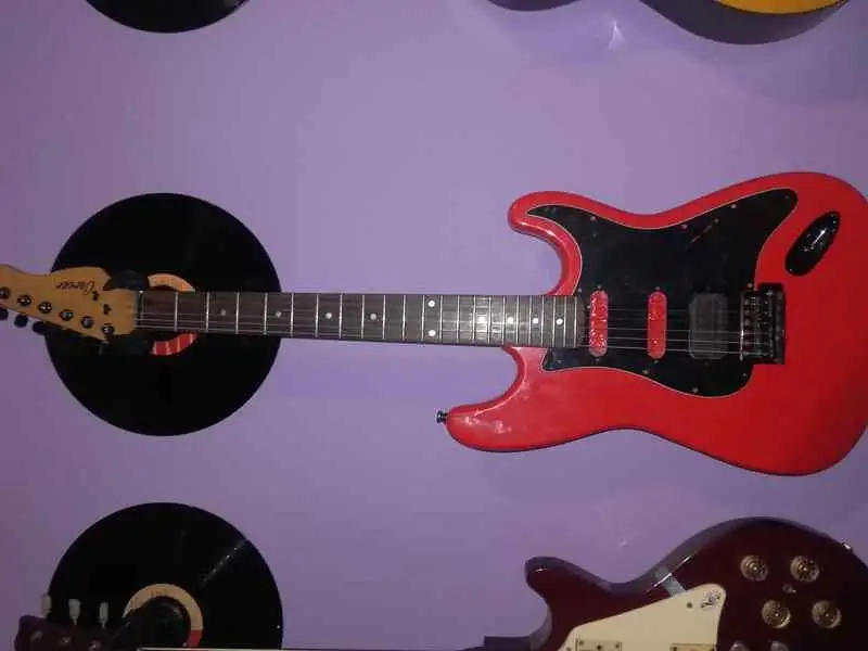 huendeskes Three guitars for sale. A project Career red black strat shape, in a semi-finished state, a converted Jolana Diamant les paul shape (with Gibson inlay) has a hairline crack in the paint on the back of the neck, requires renovation, and a Romanza classical guitar with a warped neck.
