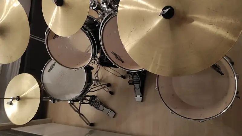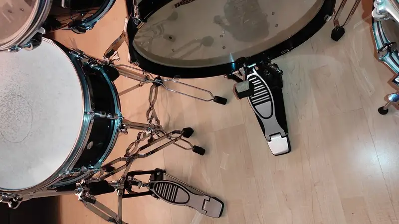 duplababás pergő, Resosim függesztésű tamok, duplalábas, memóriás állványzat, 22˝ nagydob, 12/13/16˝ tamok, 14˝ pergő.
