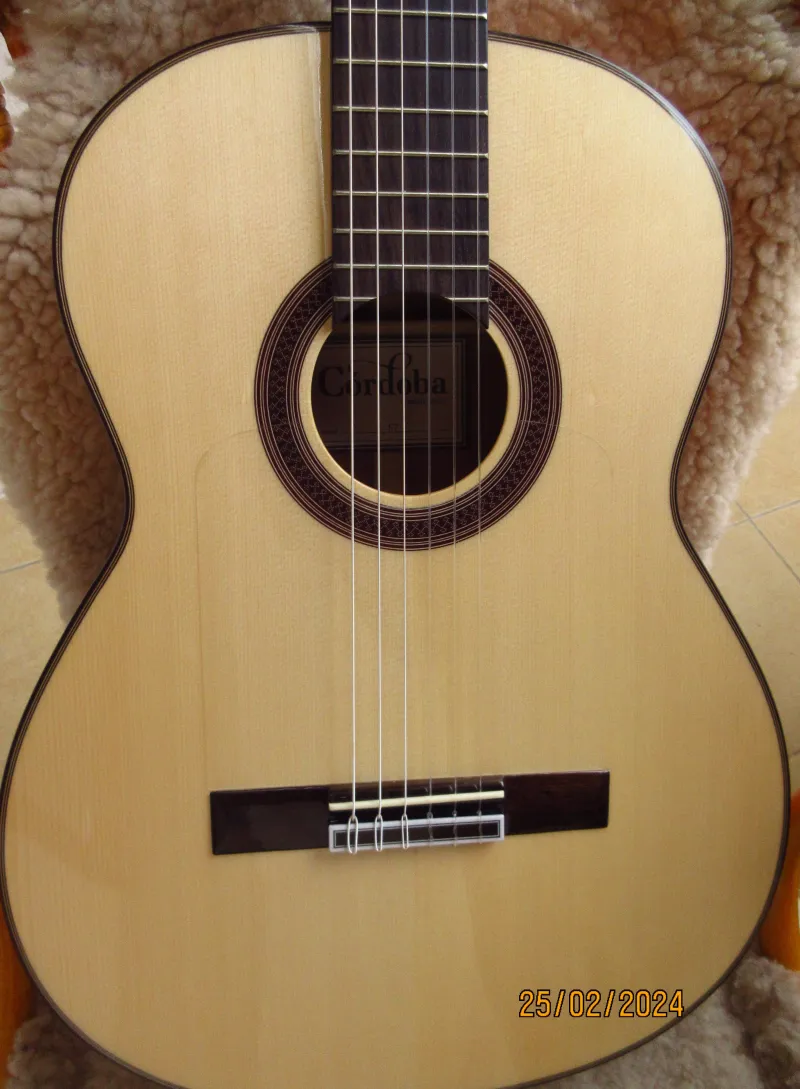 eladó : keveset használt Cordoba klasszikus gitárom kihasználatlanság miatt.A hangszer kopás-,karc- ill. sérülésmentes .Hangja tiszta, kiegyensúlyozott mély-magasakkal. Leírás : mahagóni nyak rózsafa fogólappal,2 irányba forgatható rácsos rúd, masszív lucfenyő fedlap, rózsafa híd, cypress oldal- és hátlap.Csere,beszámítás köszönöm,nem érdekel.