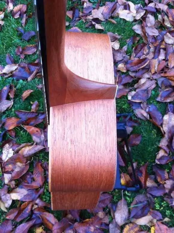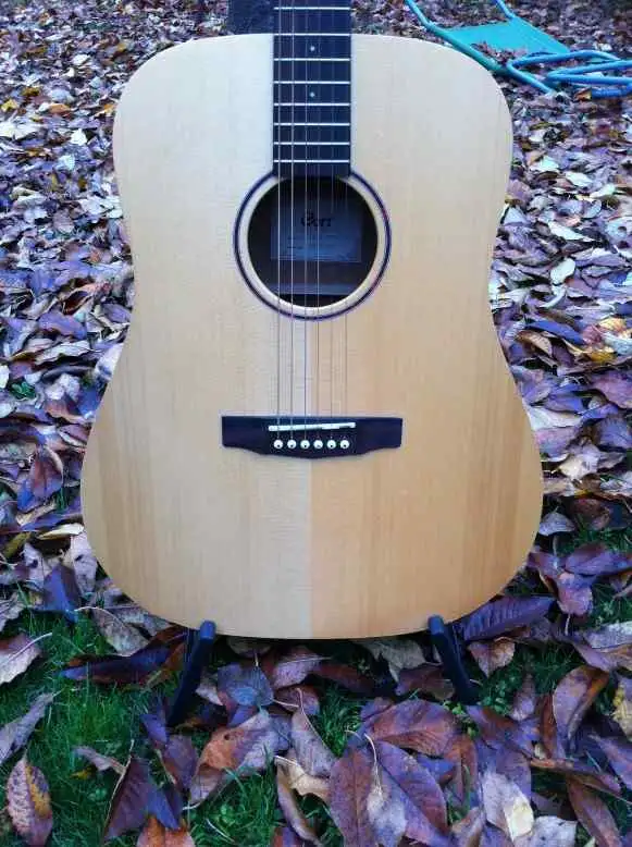 The top is solid spruce, the back and sides are beautiful mahogany, and the fretboard is rosewood.