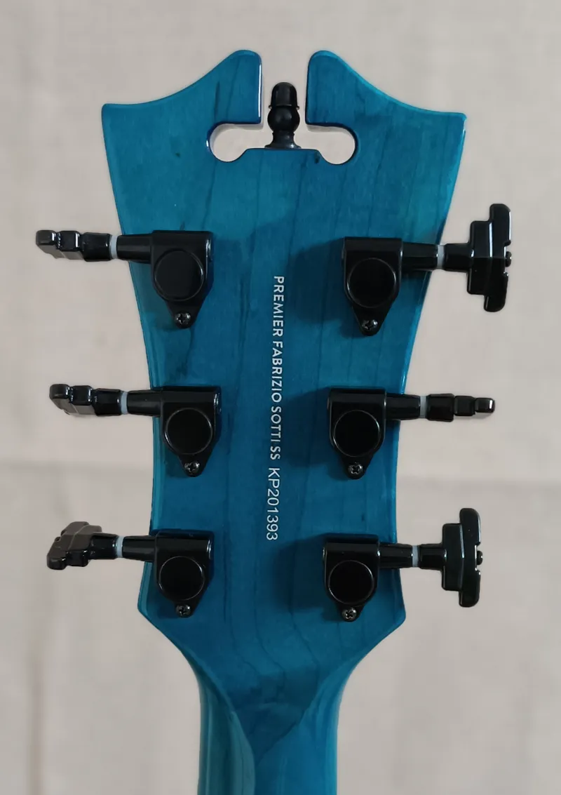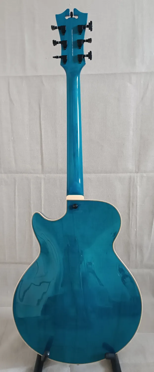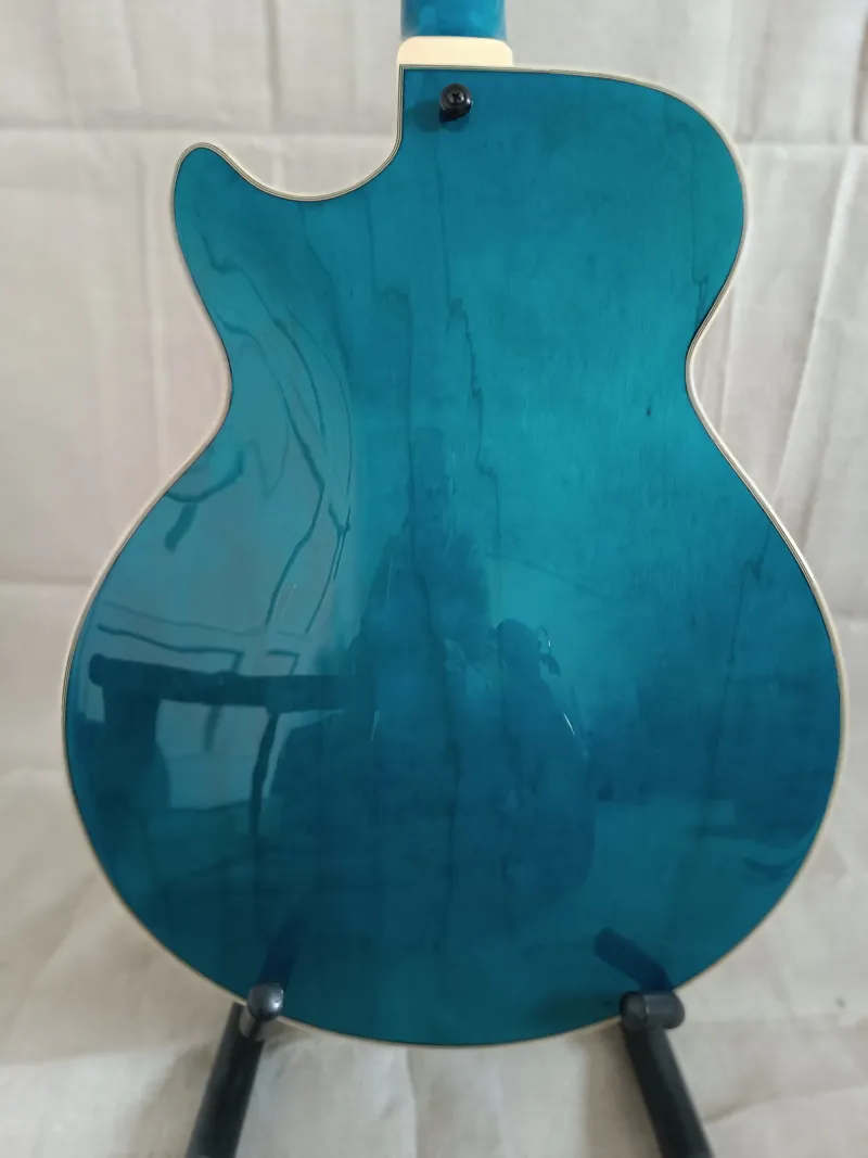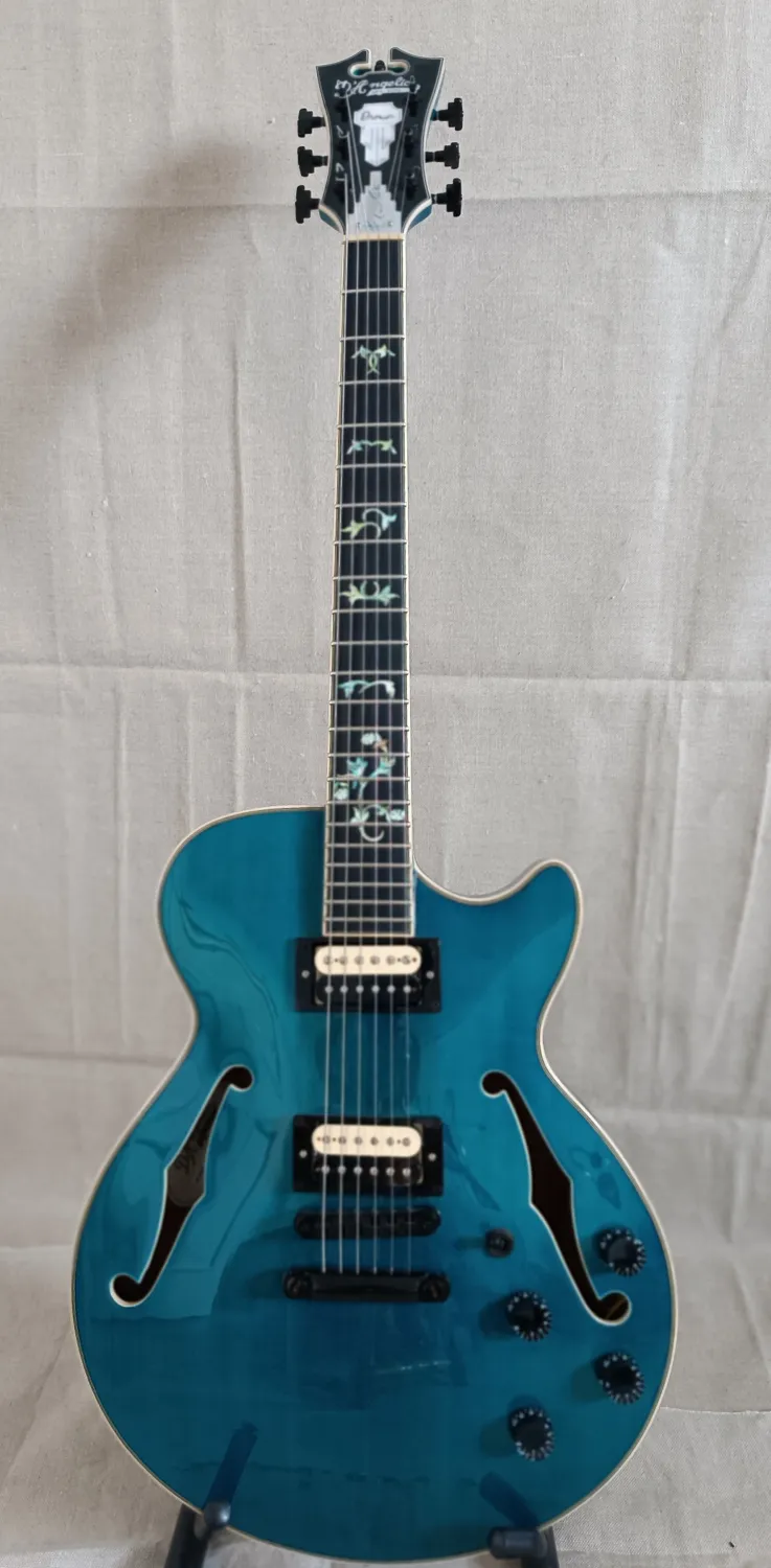 Lapos, teljesen üreges testű jazz gitár eladó. Laminált fenyő fedlap, laminált jávor hát és oldallap. Jávor nyak , ébenfa fogólap, 22 érintő. 25 colos menzúra, fogólap rádiusz 16 col. A test mélysége 1,75 col, szélessége 15 col. A Duncan Design hangszedők helyett a nyaknál egy angol kézzel készült ( CatsWhisker ) jazz humbucker van, míg aa hídnál egy kerámia mágneses Fleor humbucker. Félkemény gyári tok.Shipping