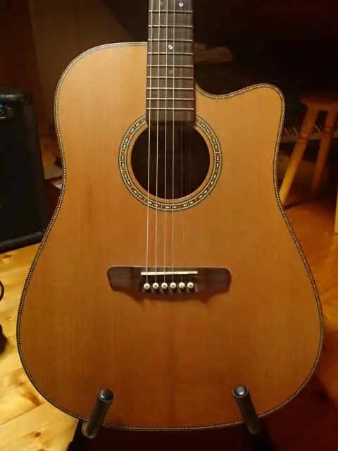 Cedar top, mahogany neck. Preparations for a wedding and moving are forcing me to put it up for sale.