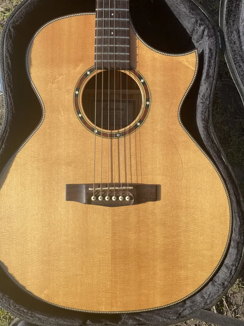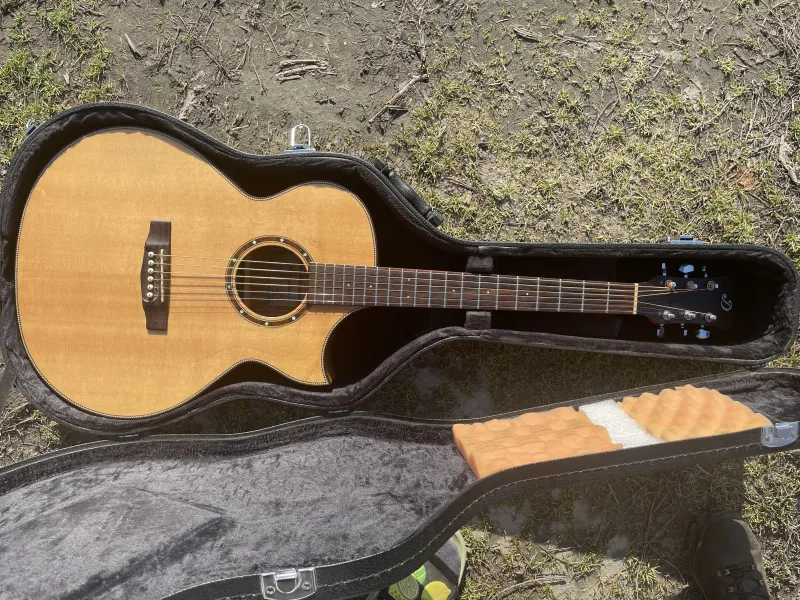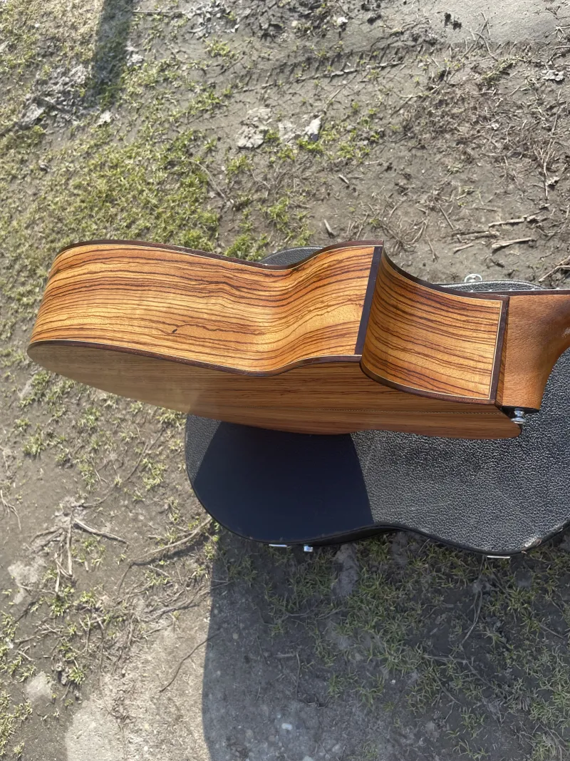 Test: Grand Auditorium forma `cutaway` kivágással Tető: Tömör kanadai cédrus Hát és káva: Zebrafa Nyak: Mahagóni Fogólap: Rózsafa