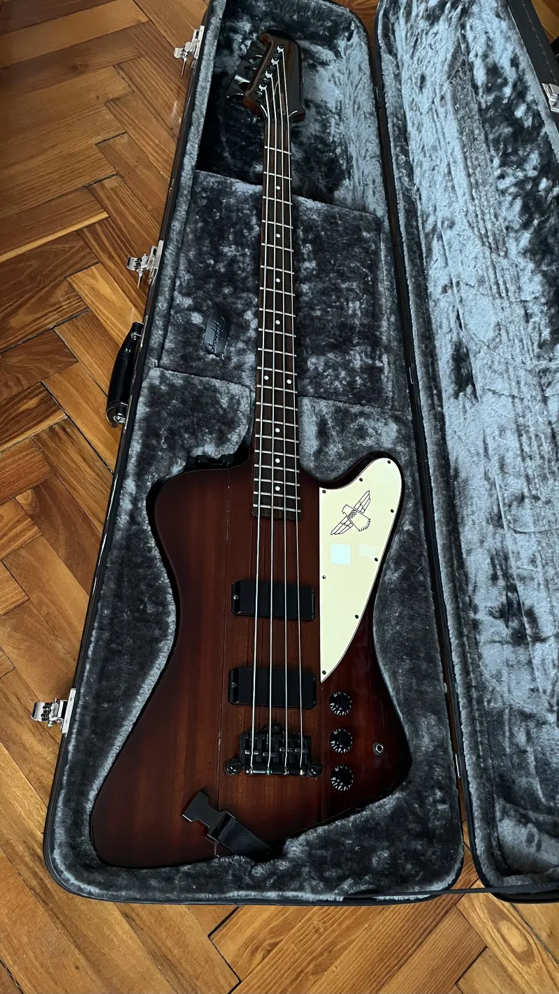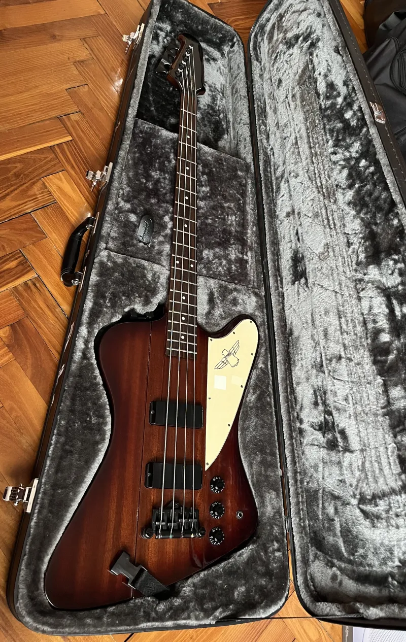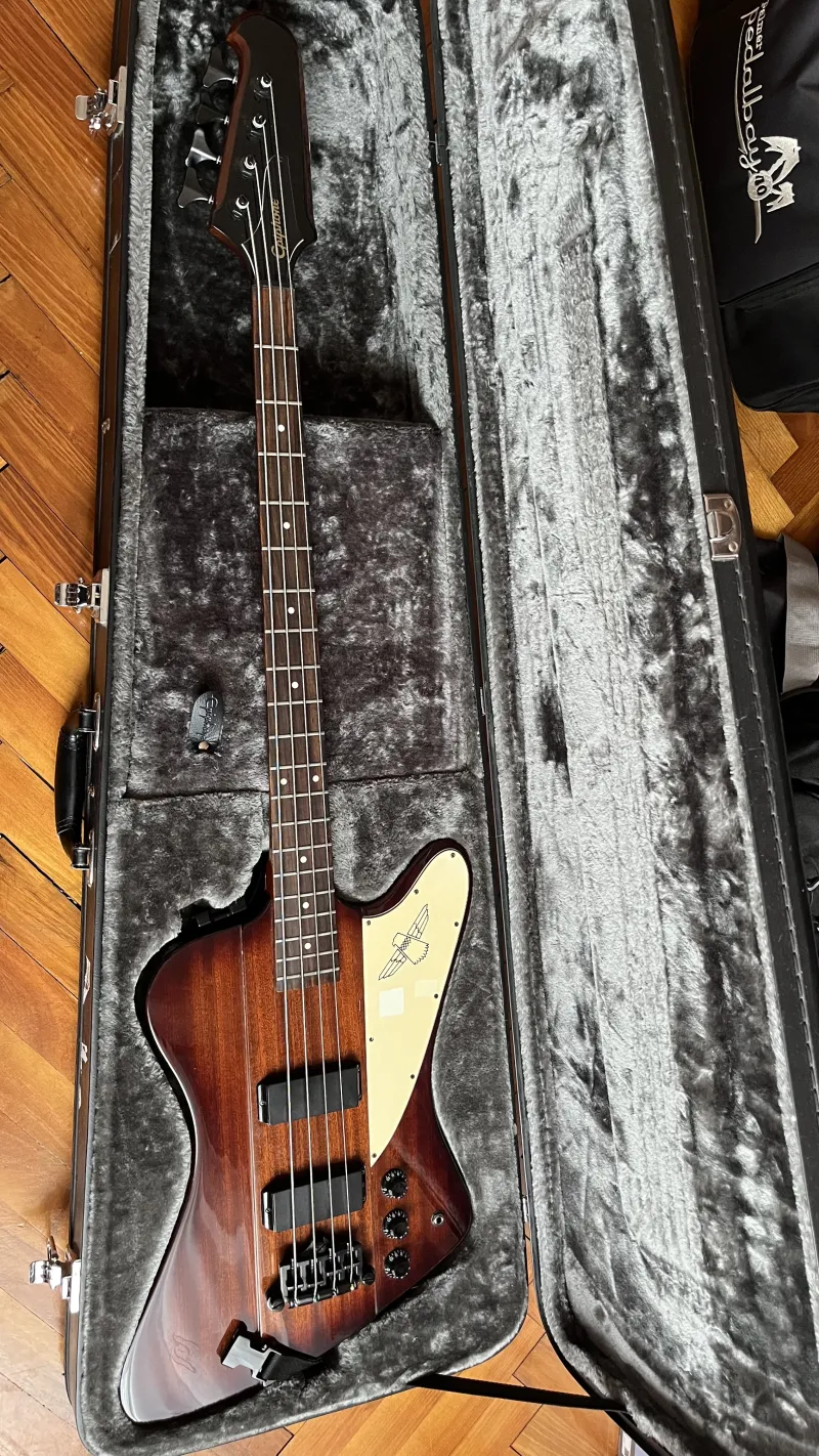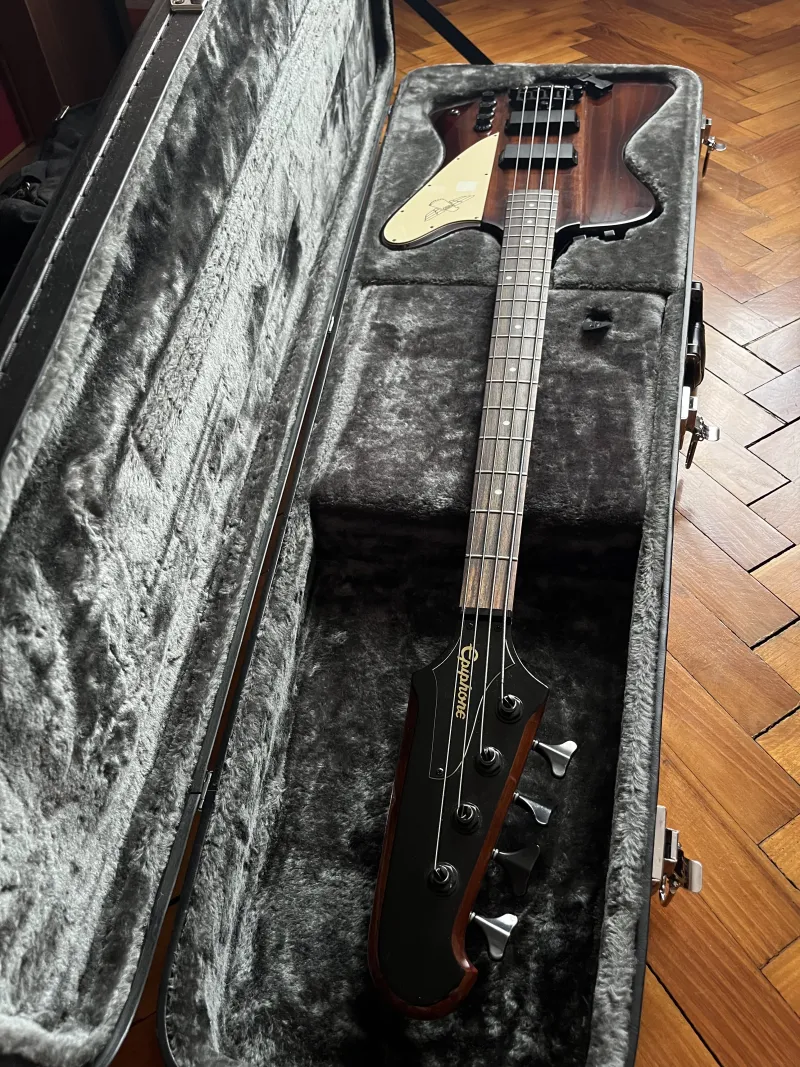 A gyári epiphone keménytok benne van az árban.Friss dunlop 45-105 stainless steel húrszett van rajta.