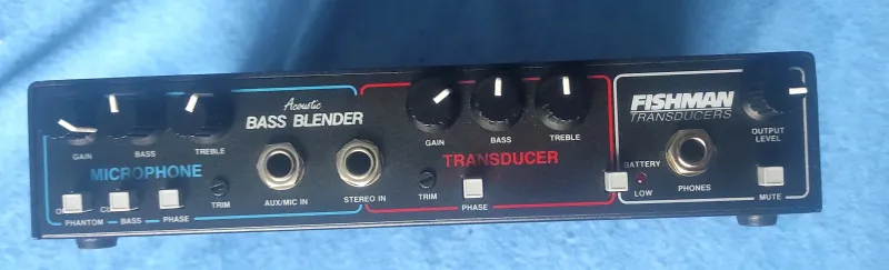 In the context of the Fishman Blender, the “transducer˝ typically refers to a pickup — usually a piezo- or co-polymer-based pickup mounted under the bridge / saddle of an acoustic bass or instrument. On older or acoustic-oriented basses, this transducer senses string vibration (and sometimes top vibration) instead of relying on magnetic pickups.