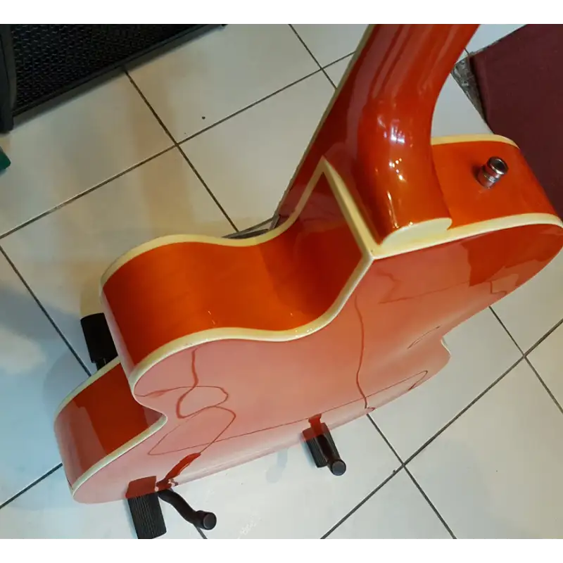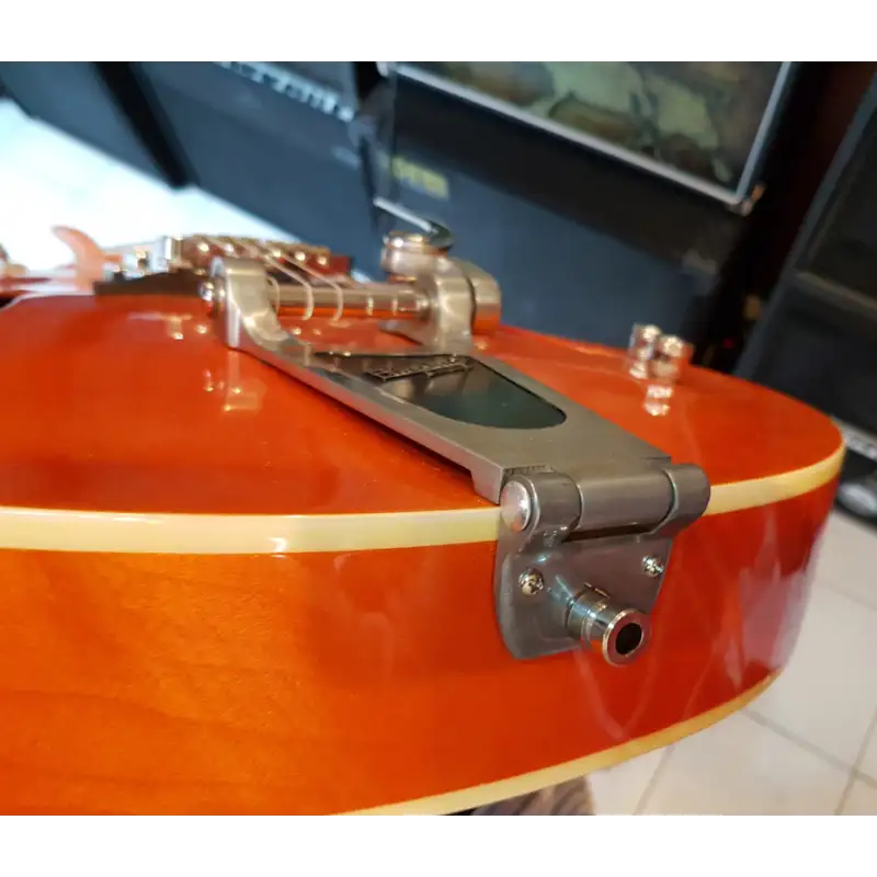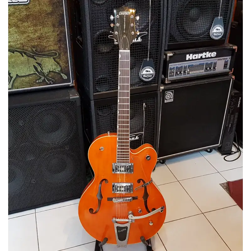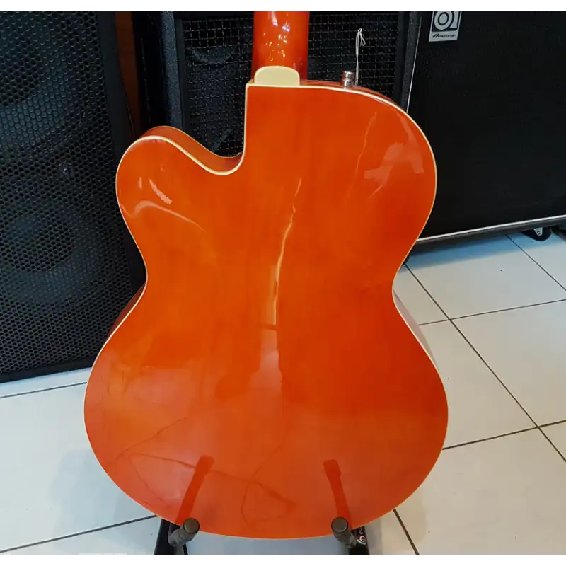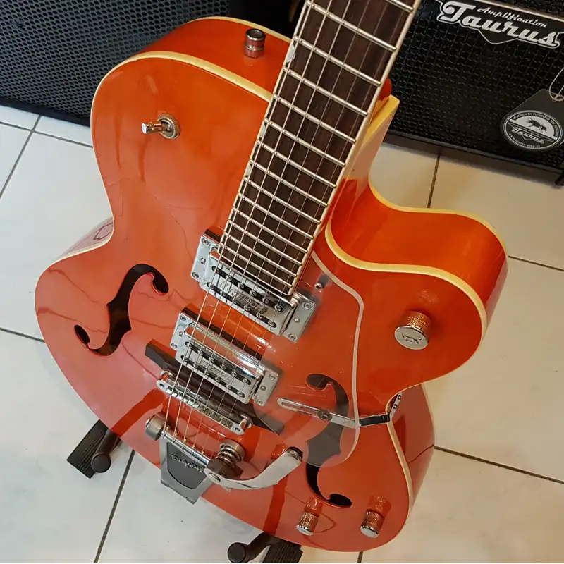 Eladó sorba került ez a gyönyörű Gretsch G5120. Jelenleg átlátszó koptató van rajta, de az eredetit is mellékeljük hozzá. Két potmétergomb hiányzott róla amikor megérkezett, ezeket pótoltuk Sandberg poti gombokkal. Néhány kisebb karcolástól eltekintve kitűnő állapotban van.